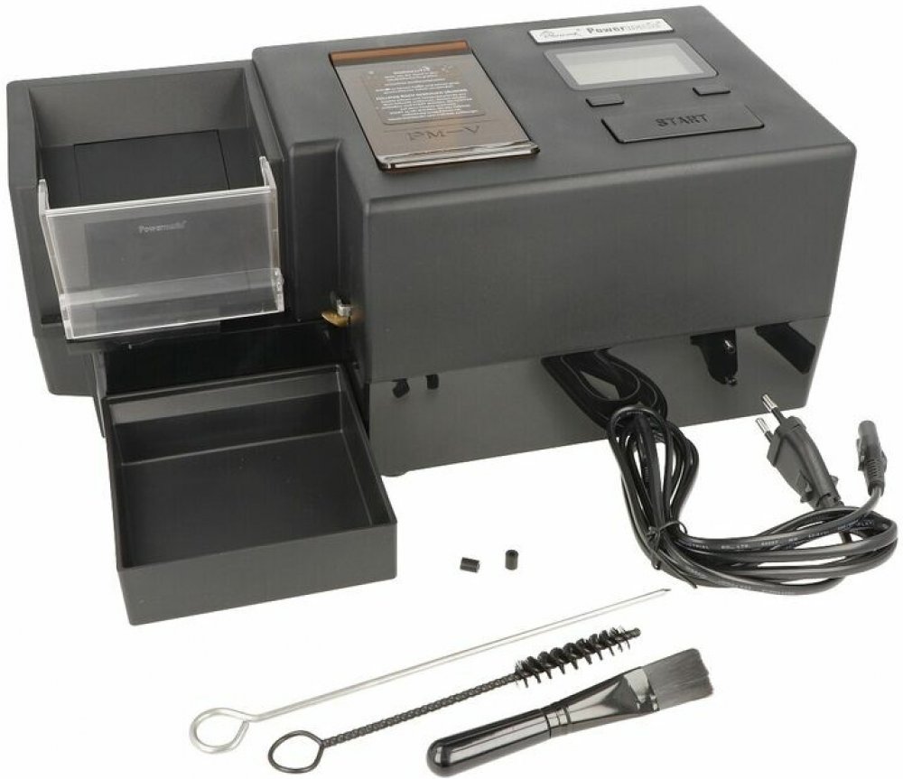 Na horní straně najdeme displej zobrazující počet naplněných dutinek a piktogramy zvolené intenzity plnění. Pod displejem najdeme velké tlačítko START pro spuštění plnění a dvě menší tlačítka - jedno pro nastavení intenzity naplnění dutinek, druhé pro nulování počtu naplněných dutinek. Na spodní části najdeme protiskluzové gumové "nožičky", které zabraňují pohybu plničky po stole. Nákupem této robustní, kvalitně zpracované plničky, dostanete to nejlepší na trhu, co můžete mít v oblasti vlastní výroby cigaret. S Powermatic V můžete naplnit velké množství cigaret a za velmi krátkou dobu. Plničky Powermatic se těší velké oblibě díky své kvalitní konstrukci a perfektní funkčnosti. Elektrická plnička cigaret Powermatic 5 je dodávaná s příslušenstvím pro čištění a údržbu.