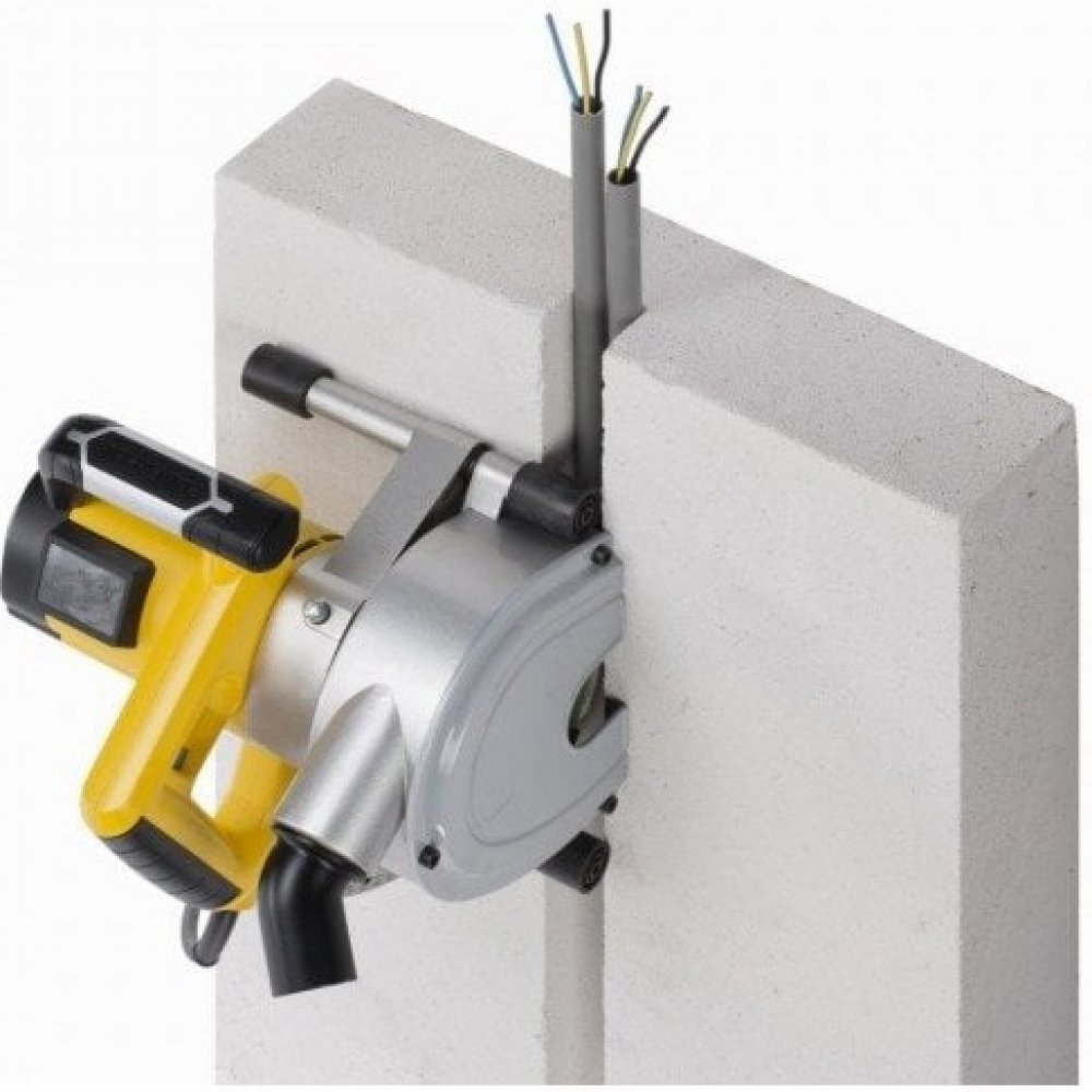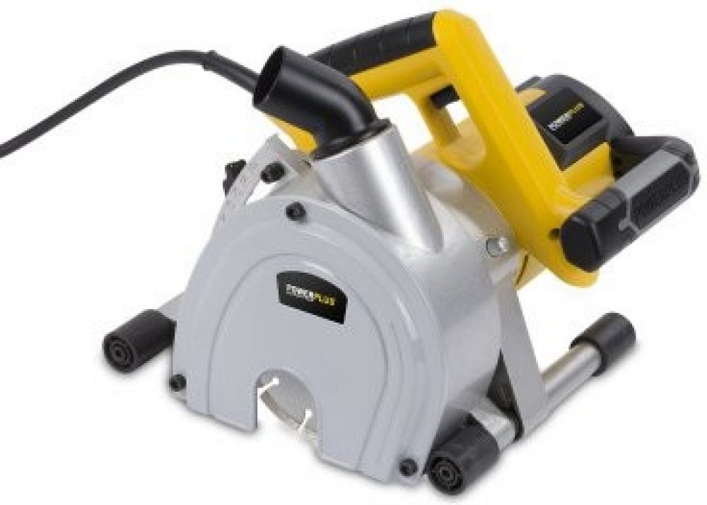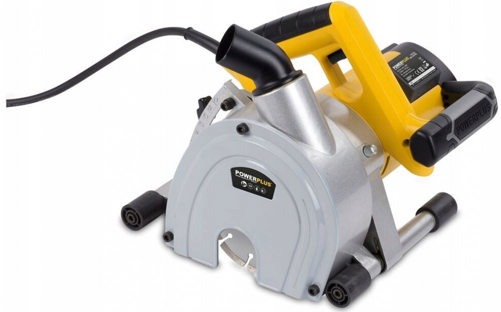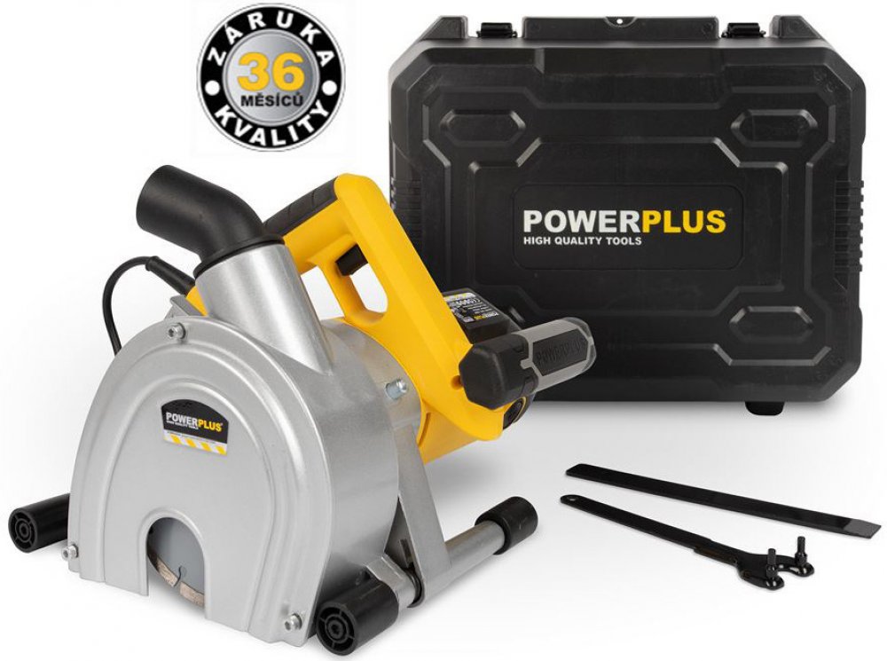 Drážkovací fréza POWERPLUS POWX0650 s příkonem 1800 W, maximální řeznou hloubkou 45 mm a nastavitelnou šířkou řezu 14/24/34/44 mm. Adaptér pro odsávání prachu.