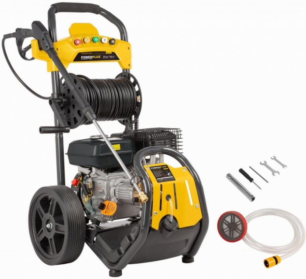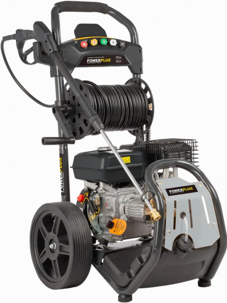 • Díky výkonnému benzínovému motoru o objemu 210 ccm zvládne tlakový čistič POWXG9100 POWERPLUS i ty nejnáročnější práce. Čtyřtaktní motor poskytuje výkon až 5100 W. Průtok vody 540 litrů za hodinu a maximální tlak až 270 barů zajišťují vždy čistý výsledek. Je to ideální benzinová tlaková myčka pro nejnáročnější úkoly. Čištění teplou vodou je možné, protože tlakový čistič vydrží teploty až 60° C. Integrovaná nádrž na čisticí prostředek zajišťuje nejčistší výsledky. POWXG9100 je vybaven vysoce kvalitním měděným čerpadlem, které zajišťuje lepší výkon a prodlužuje životnost tlakové myčky. Zařízení lze připojit k běžnému vodovodnímu řádu, ale je také vybaveno režimem sání.