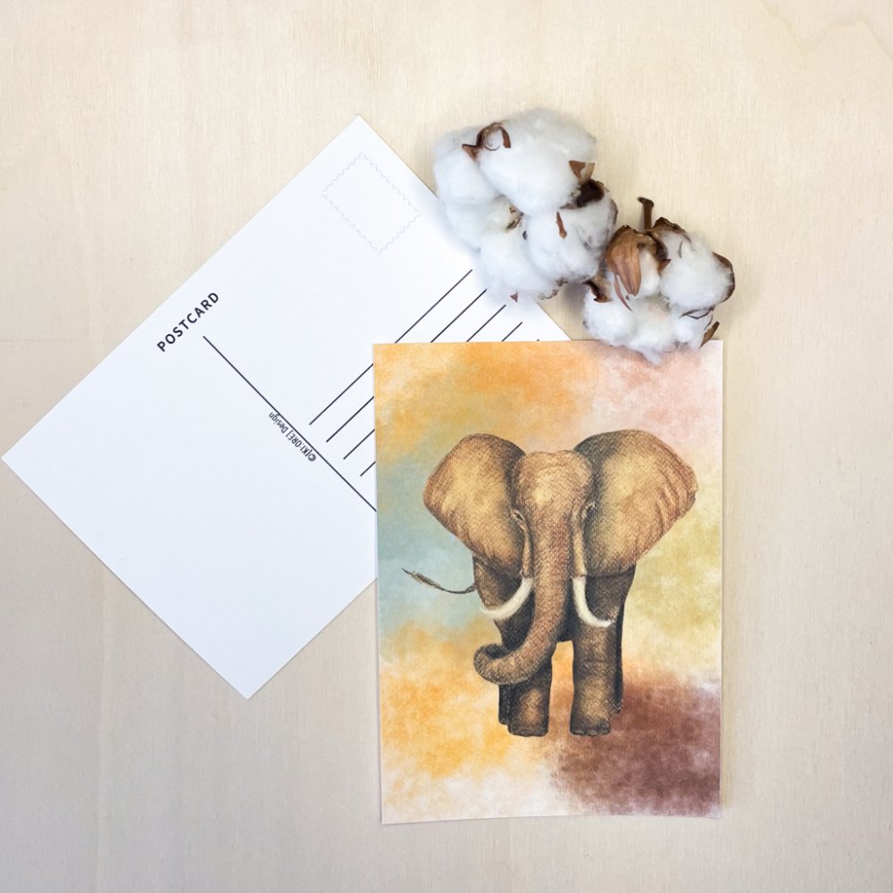 Pohlednice s tiskem autorské ilustrace slona suchým pastelem. Rozměry cca 15 × 10,5 cm (rozměry se můžou lišit vlivem ručního ořezu).