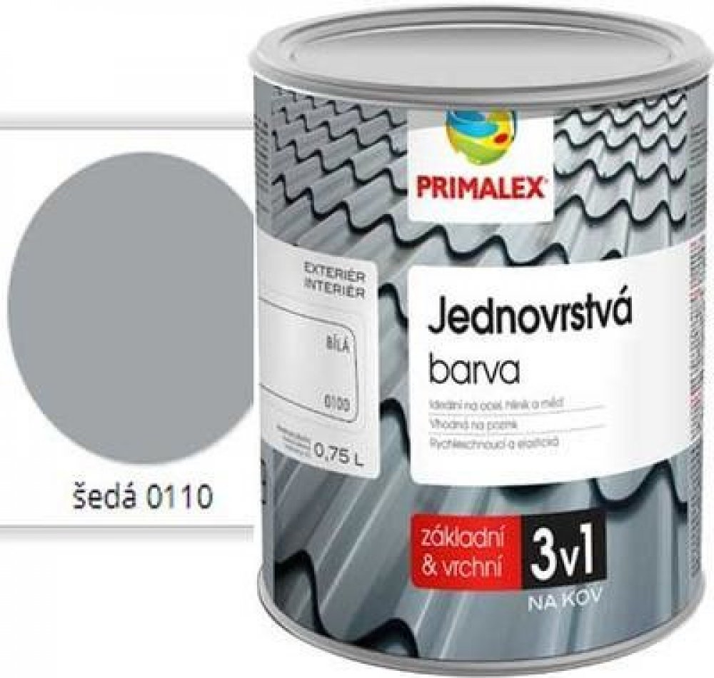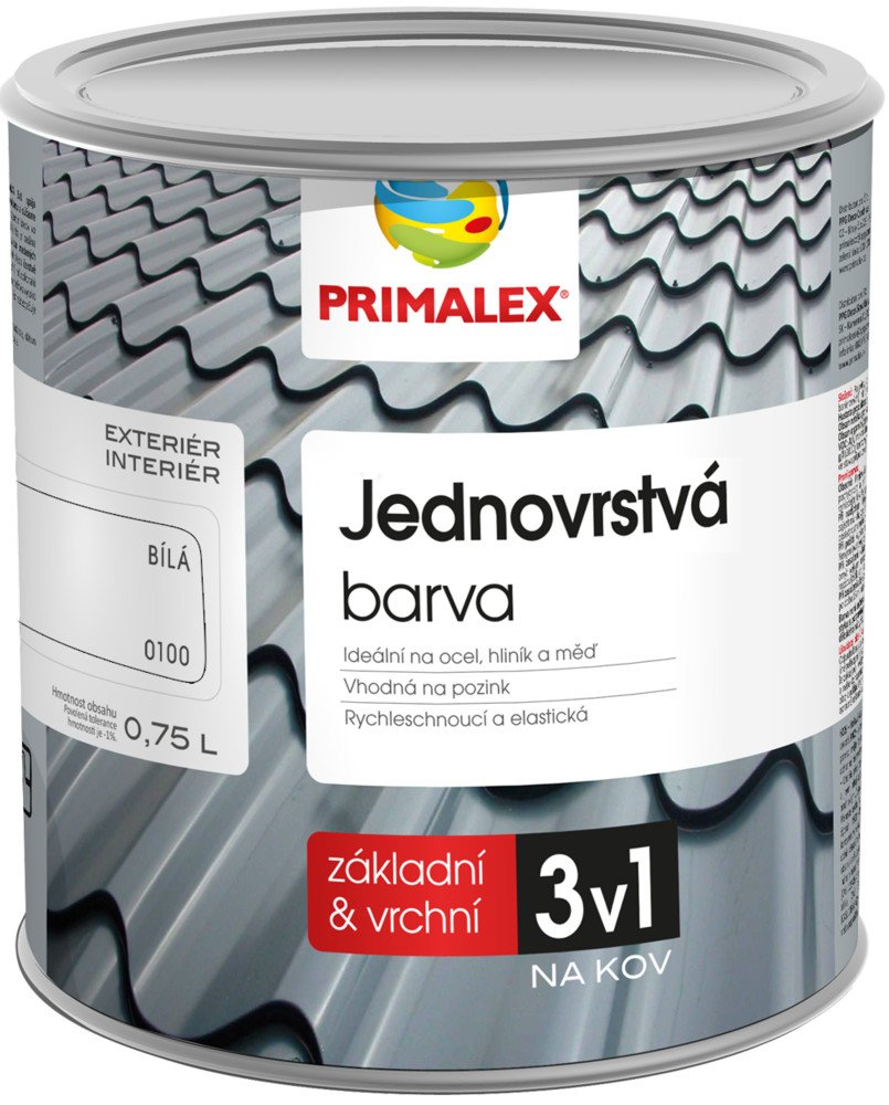 Primalex jednovrstvá barva 3v1 Primalex jednovrstvá barva 3v1 spojuje vlastnosti základního antikorozního nátěru a současně vrchní barvy. Je určena k přímým nátěrům kovů ve venkovním prostředí. Nátěr rychle schne, má dokonalou přilnavost k uváděným povrchům, je velmi pružný a vysoce odolný proti povětrnostním vlivům, což zaručuje jeho dlouhodobou životnost. Barva je ideální pro nátěry ocelových, hliníkových či měděných materiálů, stejně tak zoxidovaných nebo i čerstvě pozinkovaných povrchů. Doporučována pro přímé nátěry střech, okapů, svodů, parapetů, garážových vrat, případně stropních konstrukčních prvků. Vydatnost 8 m2/l Doporučujeme aplikaci ve dvou vrstvách.