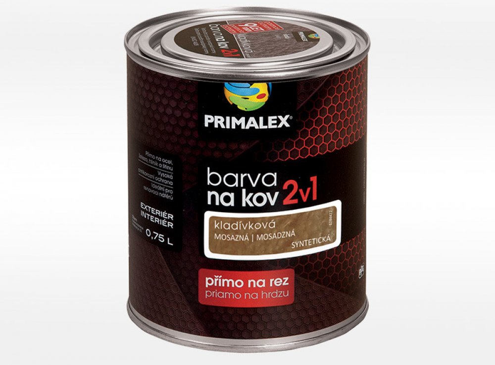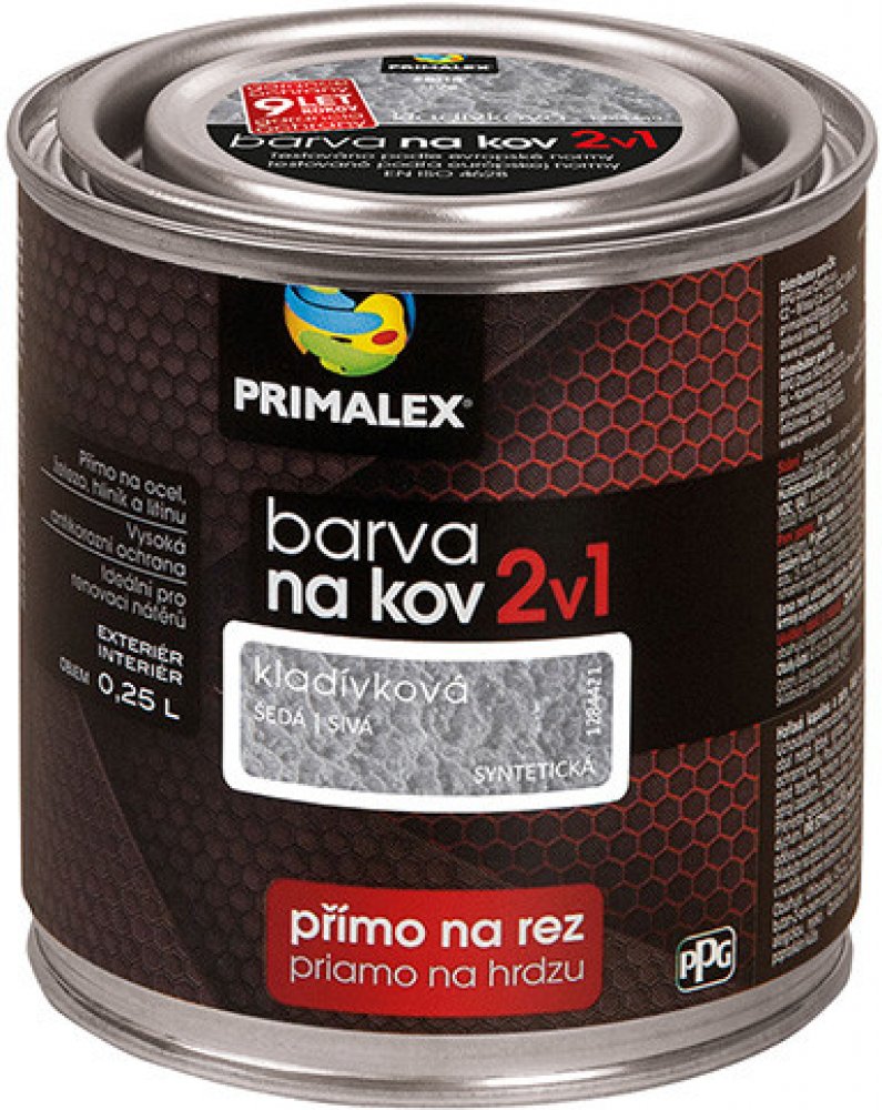 PRIMALEX barva na kov 2v1 kladívková je jednosložková syntetická barva určená k přímým ochranným nátěrům ocelových, železných, hliníkových a litinových povrchů ve vnějším i vnitřním prostředí bez potřeby použití základních barev. Zejména vhodná pro obnovu nátěrů na zkorodovaných podkladech. Dokonalá přilnavost k podkladu a vysoký stupeň antikorozní ochrany zaručují dlouhodobou životnost nátěrů. Př...