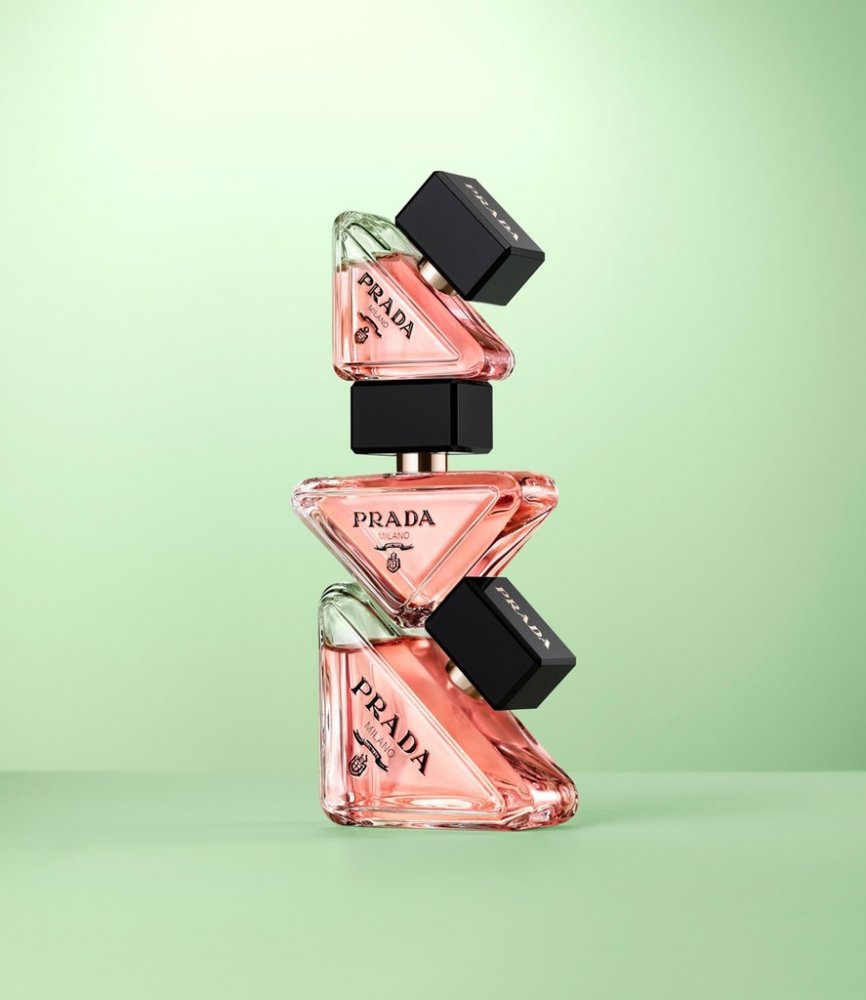 Mírně skloněný trojúhelníkový plnitelný flakon vytváří estetický pravý úhel. Smyslná korálová barva kontrastuje se sytě černou barvou loga Prada. Velmi ženský a rozpoznatelný flakon je zakončen zlatou pumpičkou s havraním černým uzávěrem.