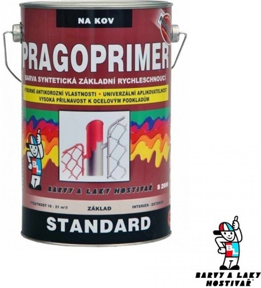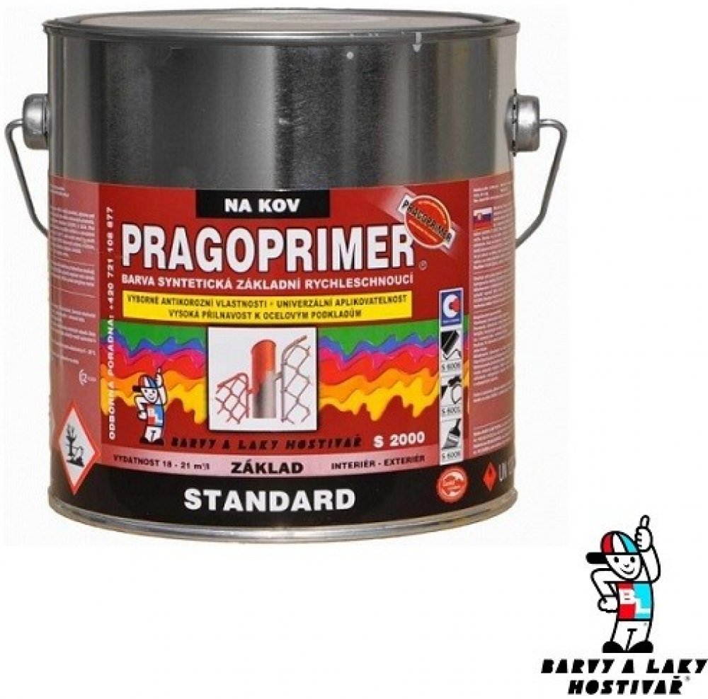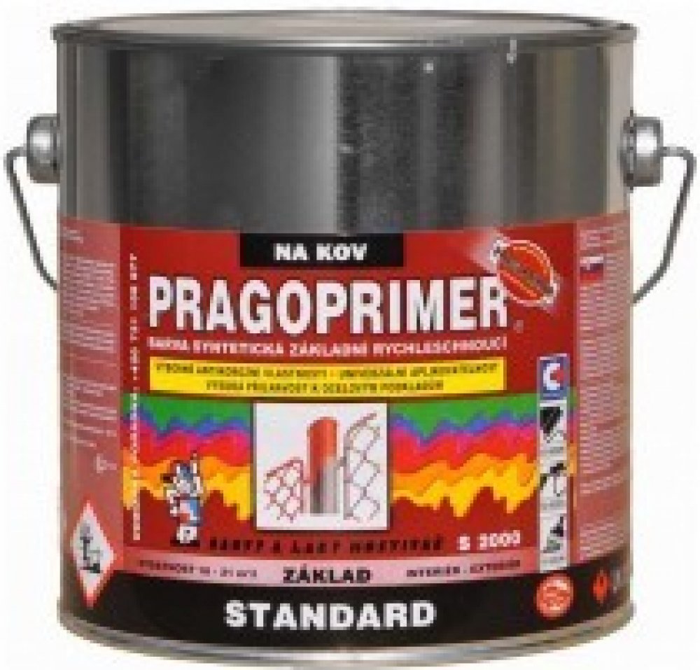 Pragoprimer Standard S2000 je univerzální základní barva na kov a savé podklady pro vnitřní i vnější prostředí, zejména pod syntetické a na vzduchu schnoucí nátěrové hmoty, k nátěrům např. plechových konstrukcí, strojů, kovového a dřevěného nábytku apod. Barva má vynikající antikorozní vlastnosti, velmi rychlé zasychání a univerzální aplikovatelnost.