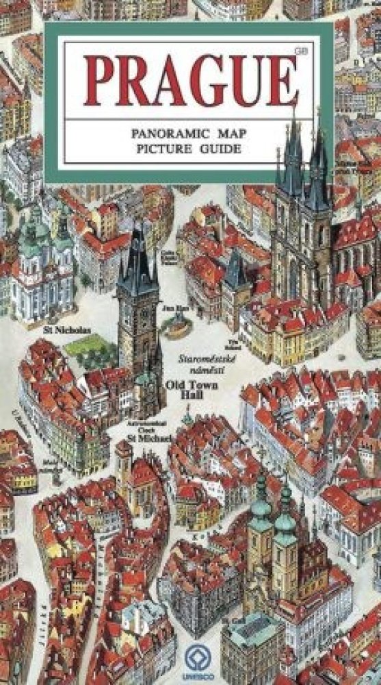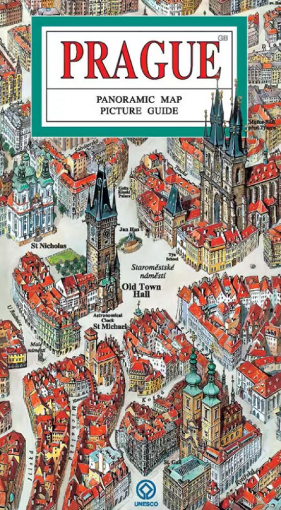 Praha - panoramatická mapa - anglicky Panoramatická mapa centra Prahy zachycuje nejfrekventovanější historické části města - v plném rozsahu Pražský hrad a Hradčany, Malou Stranu a Staré Město, větší část Nového Města a část Smíchova. Součástí obrazového průvodce jsou axonometrické průřezy nejvýznamnějšími památkami Prahy - např. bazilikou sv. Jiří, Týnským chrámem, Staroměstskou radnicí, Staronov...