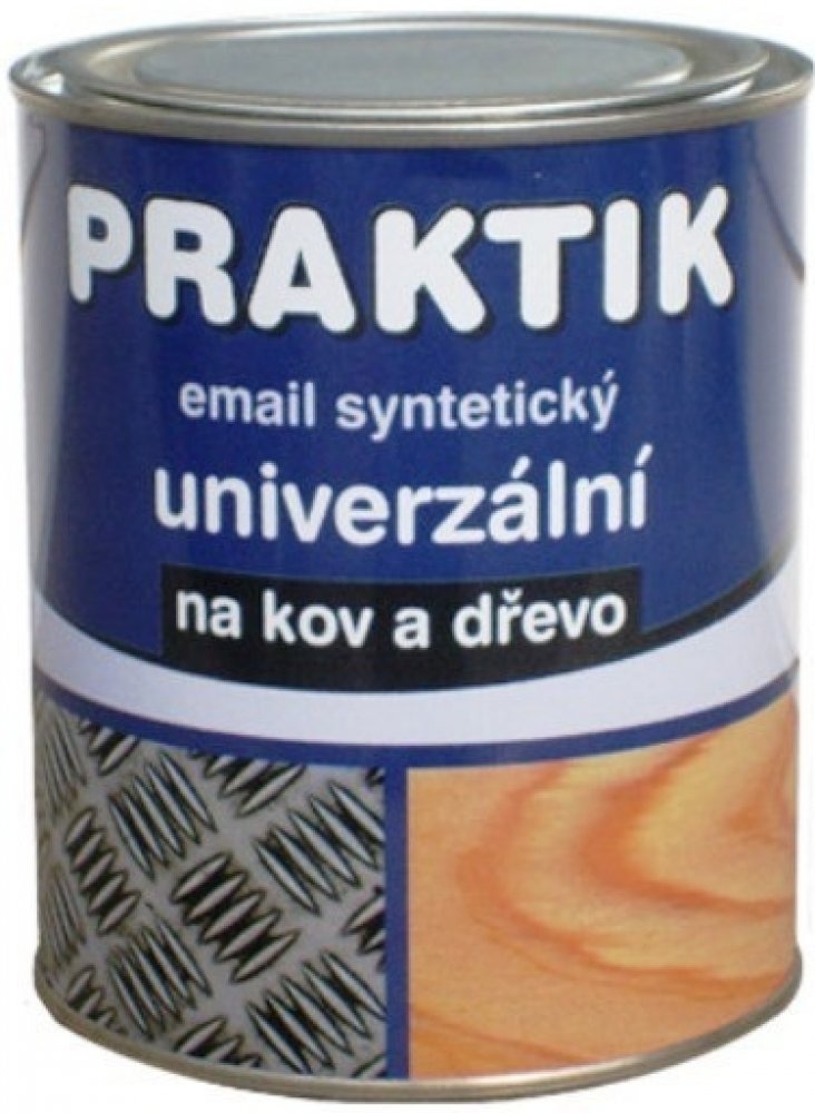 PRAKTIK Univerzální email syntetický na kov a dřevo je vrchní nátěrová hmota na bázi modifikované alkydové pryskyřice určená k vrchním nátěrům kovových a dřevěných povrchů ve venkovním i vnitřním prostředí. Nátěr se vyznačuje hedvábným leskem, dlouhou životností, vynikajicím rozlivem, výbornou kryvostí a je omyvatelný.