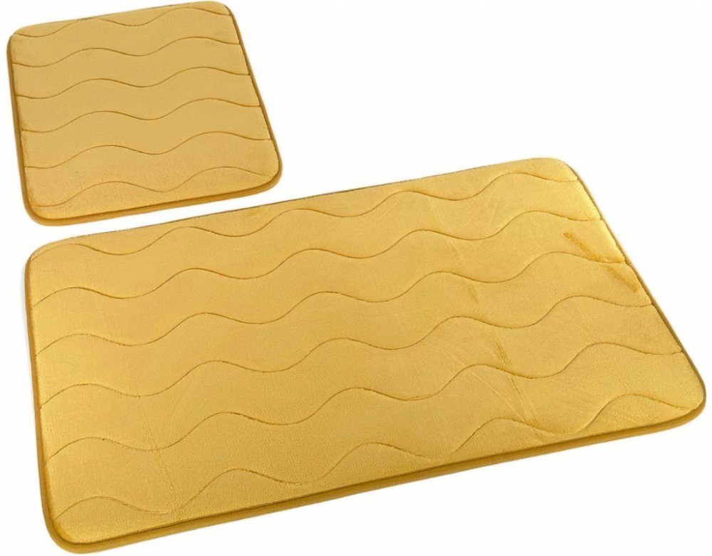 Koupelnové předložky s vlnkami v okrové barvě jsou vyrobeny ze 100% polyesteru. Kvalitní provedení z mikrovlákna zajistí nezaměnitelný komfort, měkkost a příjemný pocit při došlápnutí. Předložky jsou opatřeny protiskluzovou spodní vrstvou. Možné praní na 40°C. Předložka do koupelny je v rozměru 45 x 75 cm, na WC v rozměru 35 x 45 cm bez výkroje.