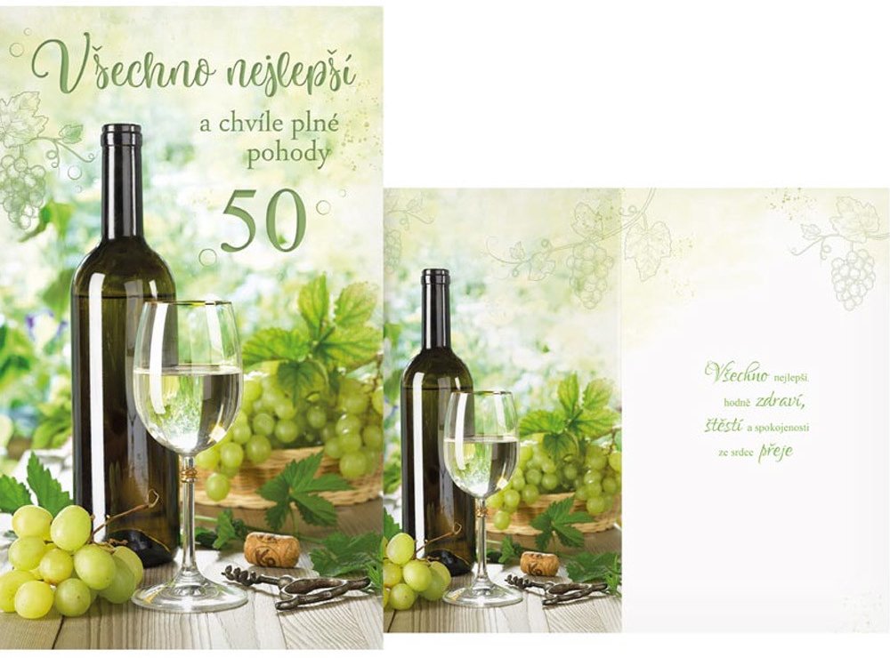Oslavte padesátku s pořádnou dávkou pohody a dobré nálady! Oslavte padesátku s pořádnou dávkou pohody a dobré nálady! Toto přání k narozeninám je jako perfektně vyzrálé víno – plné radosti, chuti do života a s kapkou elegance. Uvnitř na Vás čeká přání, které nejen potěší, ale připomene, že věk je jen číslo, a život chutná přesně tak dobře, jak si ho sami nalijeme! Přání k padesátce poslouží muži i ženě, neboť jeho motiv je v tomto směru neutrální. Přání – to je to, co přináší pohodu, úsměv a radost oslavenci. Text na přední straně: "Všechno nejlepší a chvíle plné pohody 50" Text uvnitř přání: "Všechno nejlepší, hodně zdraví, štěstí a spokojenosti ze srdce přeje" Papír: pohlednicový karton Přání je baleno v sáčku, součástí balení je i dopisní obálka.