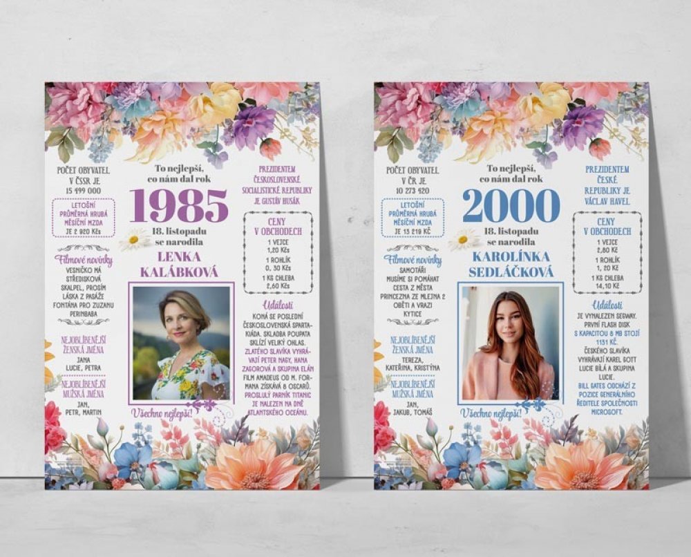 Přání k narozeninám pro ženy s jemným květinovým motivem, doplním skutečné události z roku narození, osobní text a fotografii. Pokud fotografii nemáte, doplním místo ní horoskop. Rozměr A5 nebo A4.