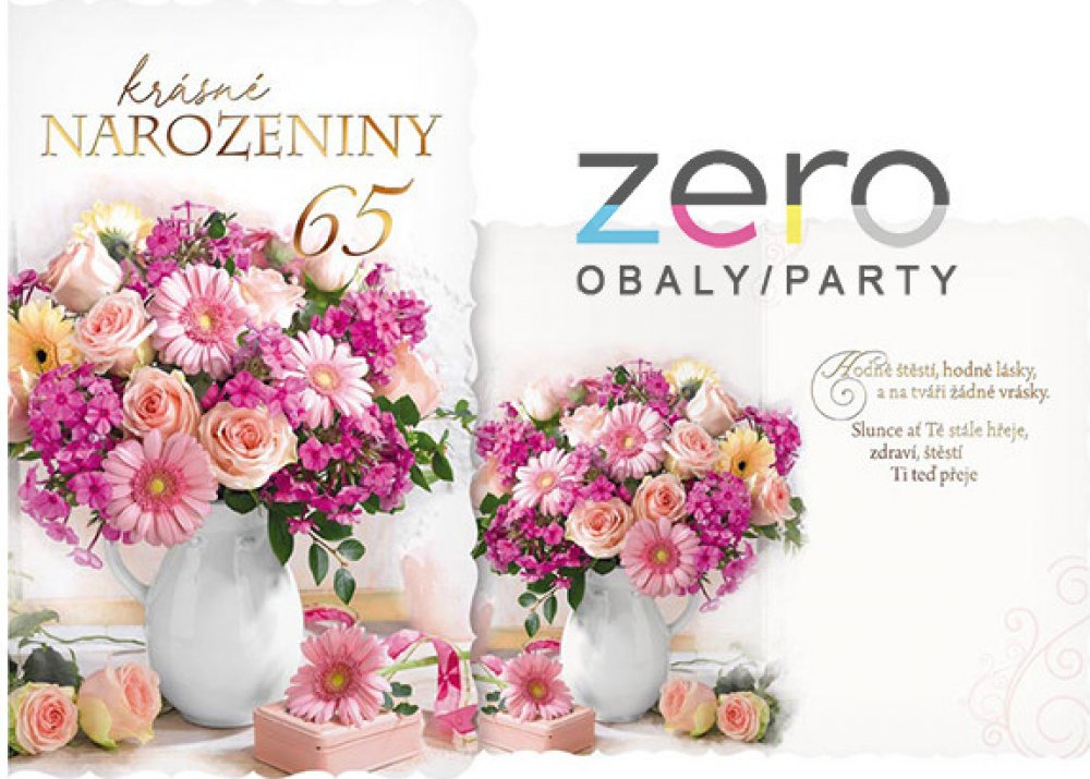 Přání s textem narozeninové 65 + obálka - kytice ve váze