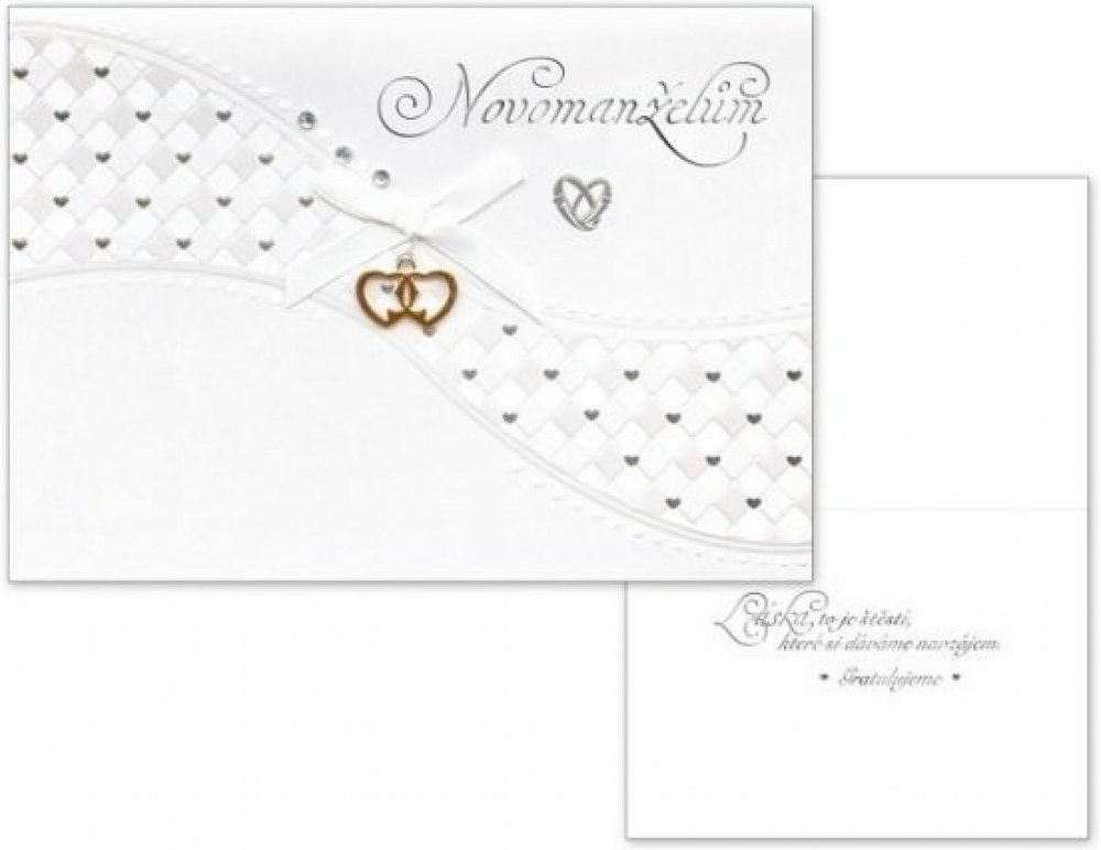 Svatební přání s textem - Svatba je příjemná a mimořádná událost a je začátkem nové etapy života. Mezi svatebními dary by nikdy nemělo chybět i přání novomanželům. Udělejte radost novomanželům a věnujte jim přání k jejich svazku, díky kterému si vždy připomenou krásné začátky jejich manželství. Nápis je vyrytý stříbrným písmem a na přání je mašlička se srdíčky. Text na přední straně přání: Novomanželům Text uvnitř přání: Láska, to je štěstí, Které si dáváme navzájem, Gratulujeme Papír: pohlednicový karton 240 g Uvedená cena je za 1 ks. Přání je baleno v sáčku. Součástí přání je i obálka.