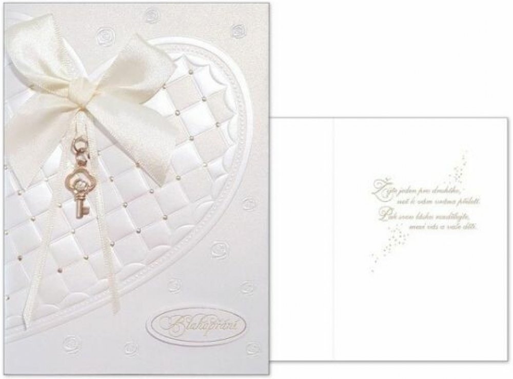 Svatební přání se srdcem a klíčkem. Svatba je příjemná a mimořádná událost a je začátkem nové etapy života. Mezi svatebními dary by nikdy nemělo chybět i přání novomanželům. Udělejte radost novomanželům a věnujte jim přání k jejich svazku, díky kterému si vždy připomenou krásné začátky jejich manželství. Nápis je vyrytý zlatým písmem a přání zdobí mašlička s klíčkem. Text na přední straně přání: Blahopřání Text uvnitř přání: Žijte jeden pro druhého, než k vám vrána přiletí. Pak svou lásku rozdělujte, mezi vás a vaše děti. Nápis je ražený zlatou folií, součástí přání je obálka.