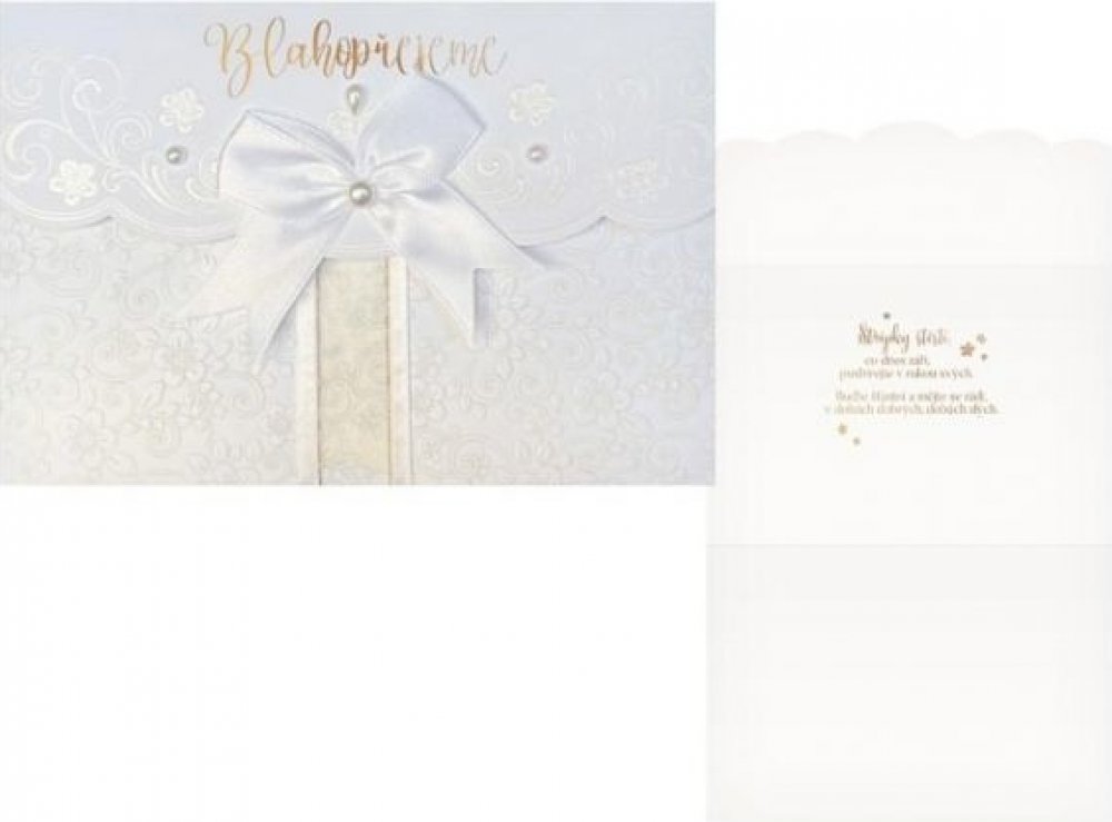 Jemná elegance a noblesa se snoubí v každém detailu tohoto přání. Zdobené embosované květinové vzory se lesknou na bílém podkladu, zatímco saténová mašle s perličkou a zlatými akcenty dodává přání punc luxusu. Zlatý text uvnitř přání doplňuje slavnostní tón a přináší poselství plné radosti a lásky. Tento design je ideální pro oslavu výjimečného okamžiku, kdy každý detail přispívá k dokonalé atmosféře svatebního dne. Text na přední straně přání: Blahopřejeme Text uvnitř přání: Střípky štěstí co dnes září, posbírejte v rukou svých. Buďte šťastní a mějte se rádi, v dobách dobrých, dobách zlých. Papír: pohlednicový karton 240 g Přání je baleno v sáčku. Součástí přání je i obálka. Uvedená cena je za 1 ks.