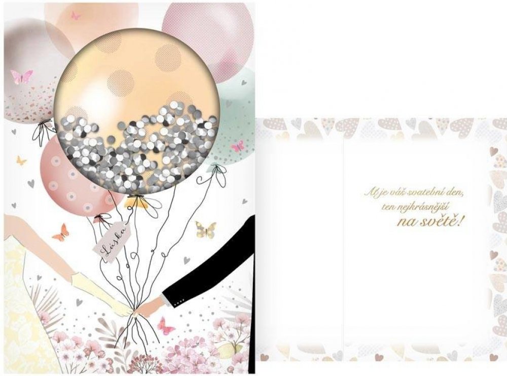 Text na přední straně přání: Láska Text uvnitř přání: Ať je váš svatební den, ten nejkrásnější na světě! Přání je baleno v sáčku, součástí balení je i dopisní obálka. Rozměr: 115mm x 170mm x 2mm (Š x V x H)