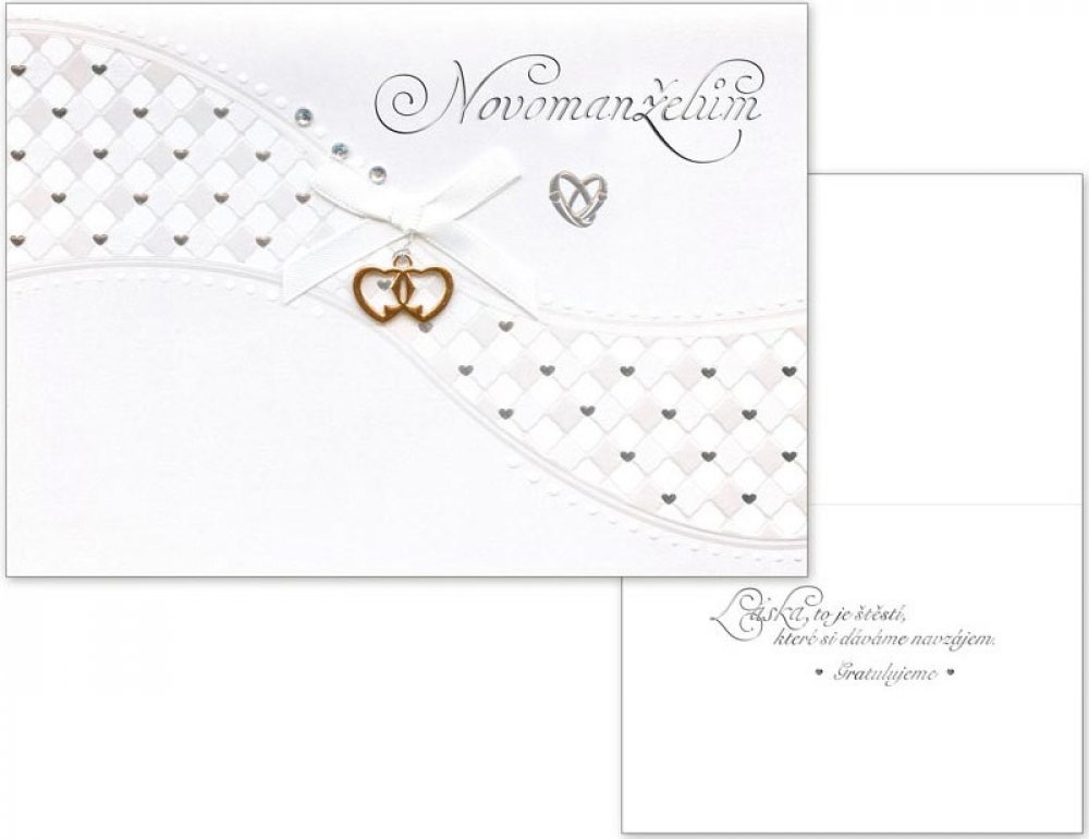 Nápis je vyrytý stříbrným písmem a na přání je mašlička s kovovými srdíčky. Svatební přání s textem pro novomanžele. Nápis je vyrytý stříbrným písmem a na přání je mašlička s kovovými srdíčky. Text na přední straně přání: "Novomanželům." Text uvnitř přání: "Láska, to je štěstí, které si dáváme navzájem, gratulujeme." Papír: pohlednicový karton 240 g. Součástí přání je i papírová obálka. Rozměr: 12...