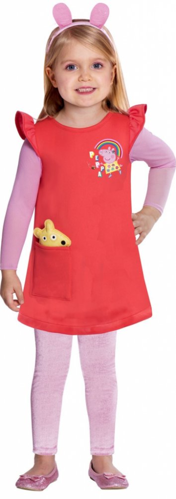 Kostým oblíbené postavy Prasátko Peppa. Hodí se jako převlek na Halloweenskou party, karneval, oslavu narozenin nebo pro každodenní převlékací hry! Je vaše dítě velkým fanouškem prasátka Peppy? Pak právě tento kostým s aplikacemi veselé postavičky Peppy bude to pravé. Šaty mají nabírané rukávy a sukni s kapsičkou jako schovku pro malého plyšáčka. Součástí balení jsou legíny, čelnka a plyšák. Balen...