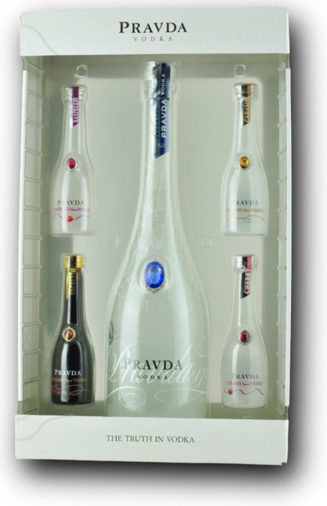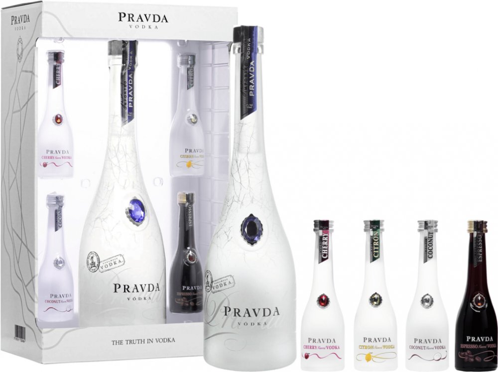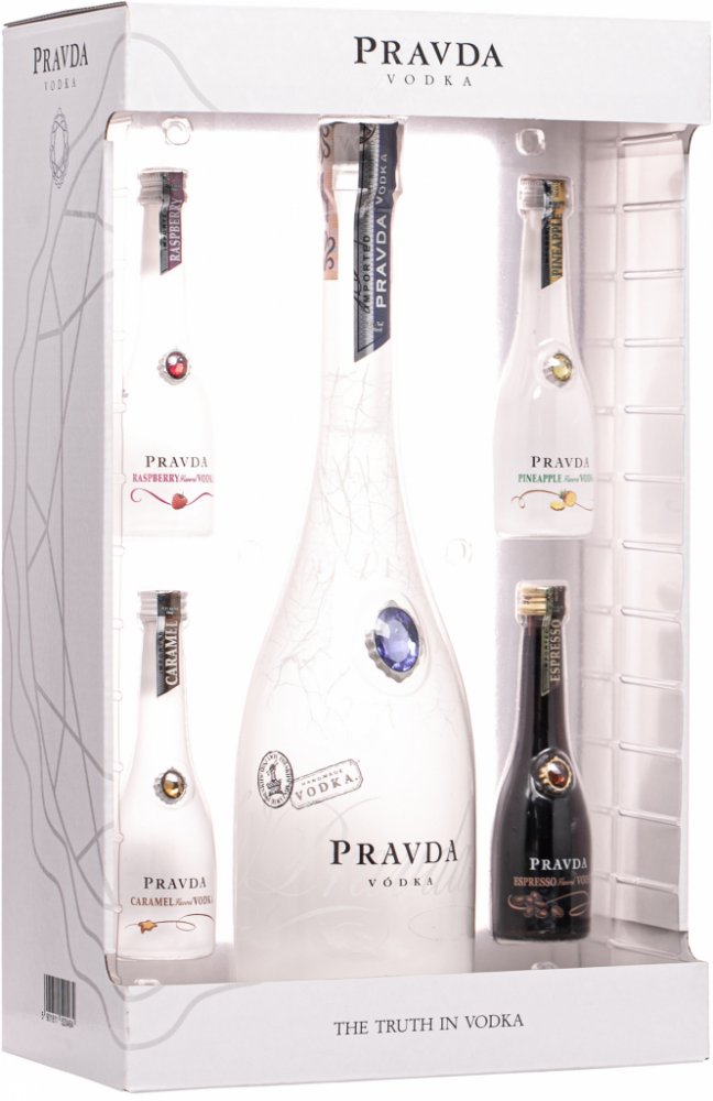 Balení obsahuje 0,7l láhev Pravda vodky a 4 ochucené miniaturky Pravda vodky - karamel, espresso, malina a ananas. Příchutě se mohou lišit.