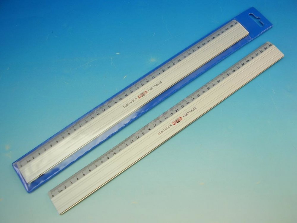 Pravítko 40 cm s řezací úpravou z kvalitní hliníkové slitiny, vhodné pro rýsování rovných čar, ve spodní části plastová protiskluzová vložka, která zabraňuje jeho posunutí, milimetrová stupnice tištěná na spodní straně zkosené hrany, vhodné pro kancelářské použití, ale i pro uměleckou tvorbu.
