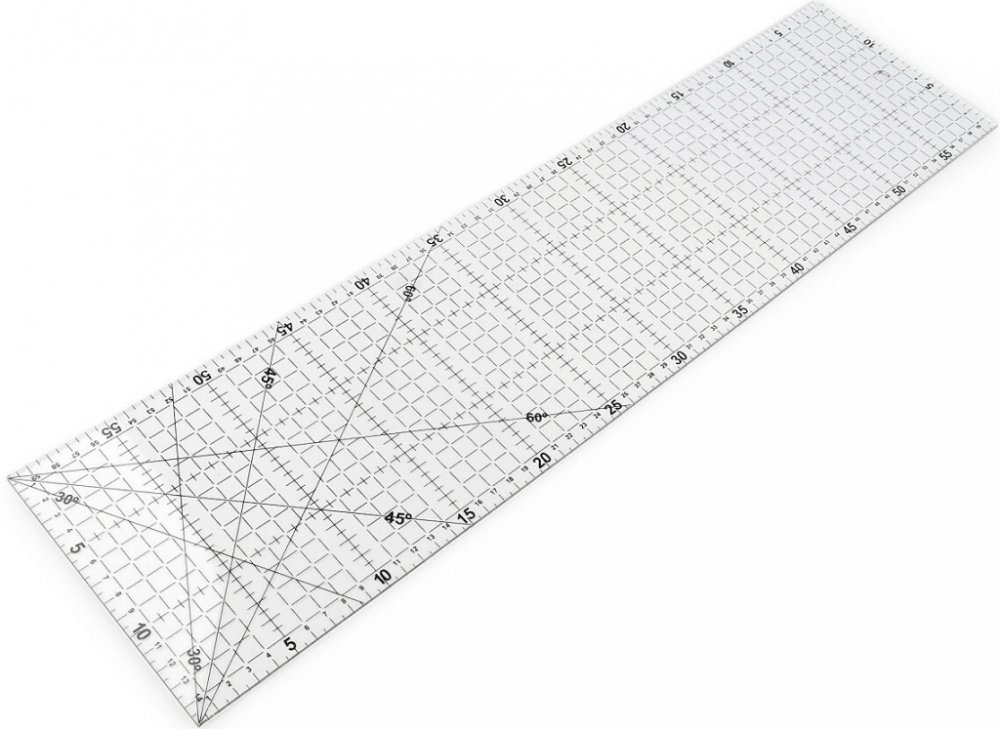 Dlouhé plastové pravítko oceníte pro jeho univerzálnost. Je pevné, dá se využít nejen na techniku patchwork, ale i na další ruční práce jako jsou quilting, scrapbooking a šití. Vyznačené jsou hodnoty po půl cm a úhly 30°, 45° a 60°.