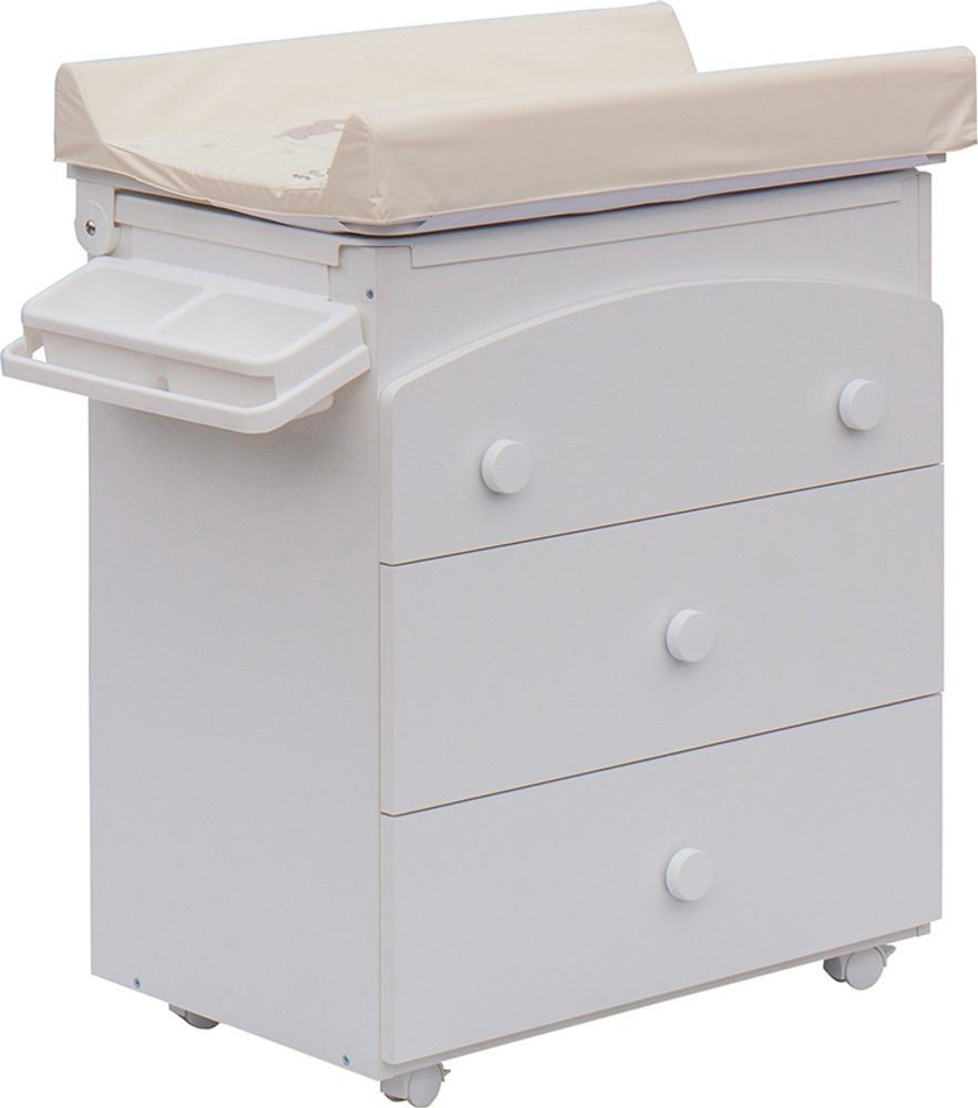 Laminátová přebalovací komoda je doplněna o plastovou vaničku s odkládacími boxy. Vanička je umístěna pod deskou. Pro snadný odvod použité vody je komoda doplněna výtokovou hadicí s uzávěrem. Vaničku lze zcela vyjmout a komodu lze používat jako běžný nábytek do dětského pokoje.