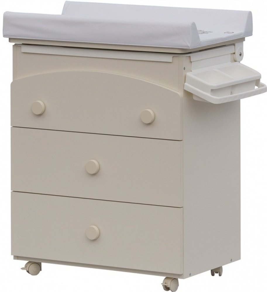 Komoda je také opatřena plastovými kolečky, dvě jsou s brzdou. Komodu lze tedy velmi jednoduše přesouvat dle potřeby. Horní deska nad vaničkou je připevněna na otočných kloubech pro snadné zvedání. Komoda je dále opatřena třemi velkými šuplíky.