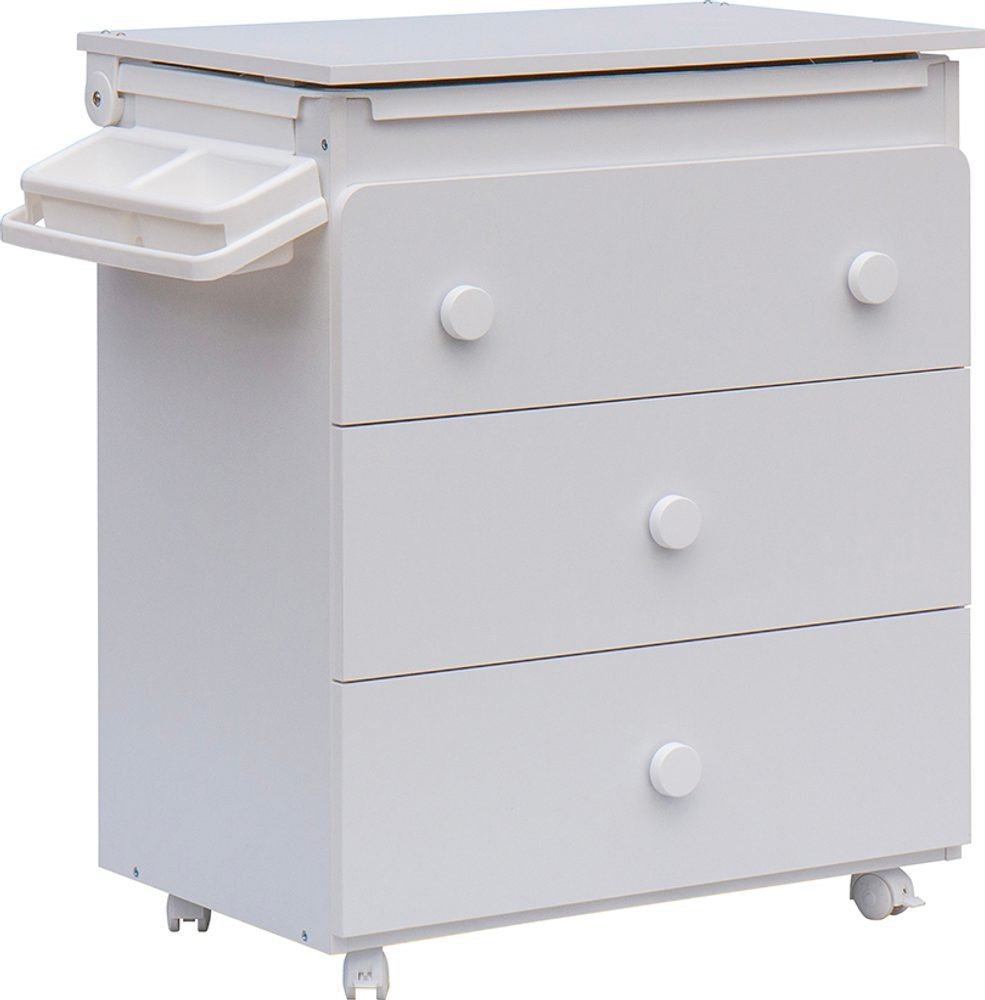 Komoda je také opatřena plastovými kolečky, dvě jsou s brzdou. Komodu lze tedy velmi jednoduše přesouvat dle potřeby. Horní deska nad vaničkou je připevněna na otočných kloubech pro snadné zvedání. Komoda je dále opatřena třemi velkými šuplíky.