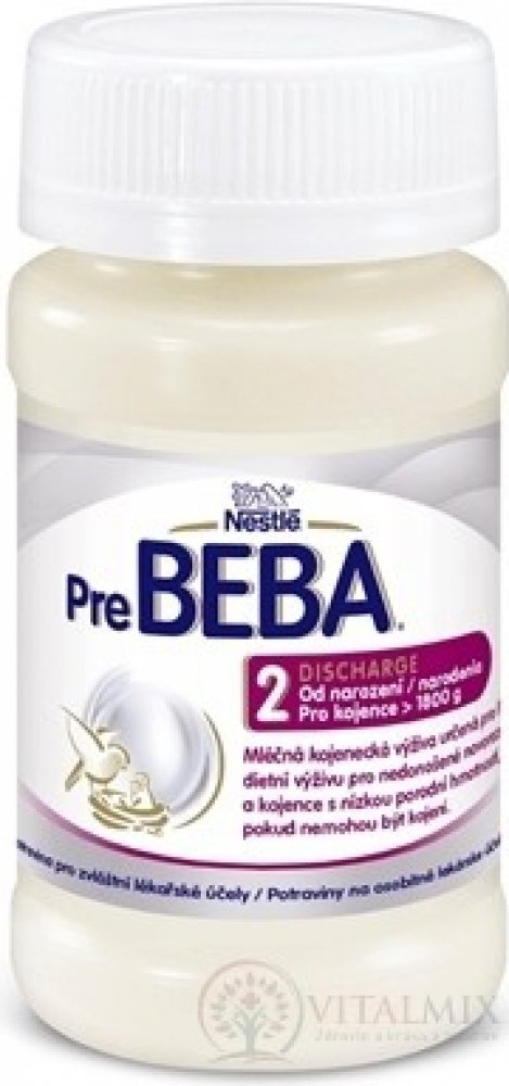 Nestlé Beba Pre 2 Discharge Mléčná kojenecká výživa pro řízenou dietní výživu 90ml PreBEBA 2 DISCHARGE je potravina pro zvláštní lékařské účely, mléčná kojenecká výživa pro řízenou dietní výživu pro nedonošené novorozence a kojence s nízkou porodní hmotností > 1800 g, pokud nemohou být kojeni, 90 ml lahvička.