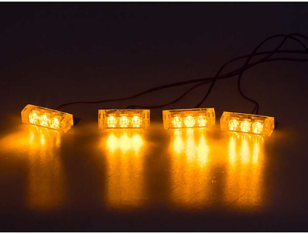 4 přídavná oranžová výstražná LED světla pro externí povrchovou montáž, především do přední mřížky vozidla. Technické parametry:•4 vysoce výkonných LED diod superflux (v každém světle 3 diody)•3 režimy výstražného problikávání•minimální odběr proudu (cca 90 mA)•odolná konstrukce proti vlhkosti a otřesům•dlouhá živostnost až 100.000 hodin•napájecí napětí 12 V•pracovní teplota - 30 - + 65°C•rozměr světla 12 x 48 x 15 mm.