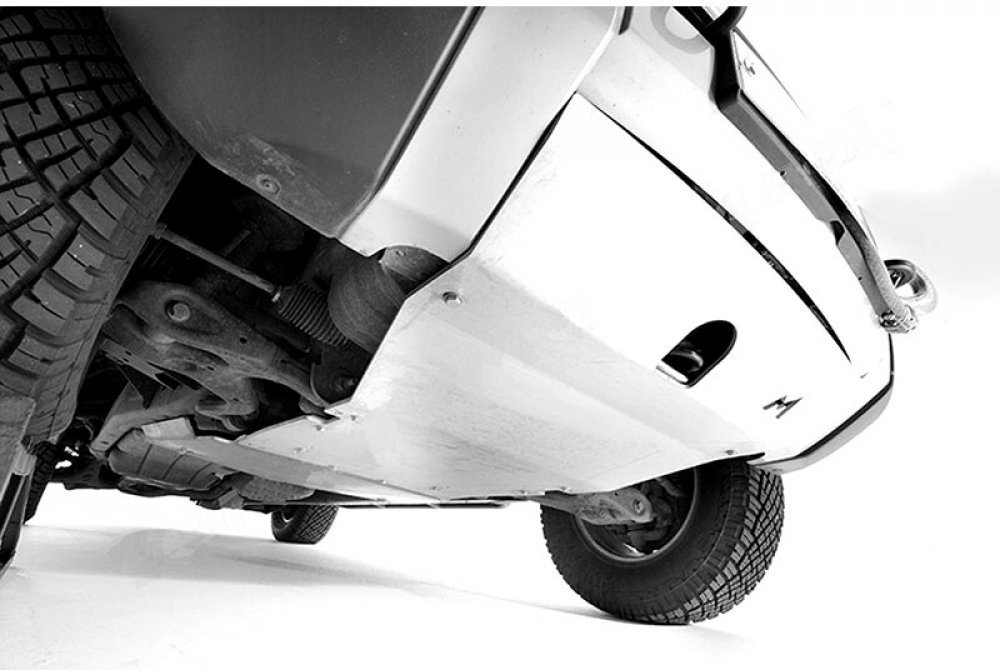 Duralová ochrana o síle 8mm nahrazuje plastový kryt spodní přední části vozidla. Na rozdíl od původního krytu poskytuje výraznou ochranu chladičů. Pro montáž není potřeba žádných úprav, používá existující montážní otvory.