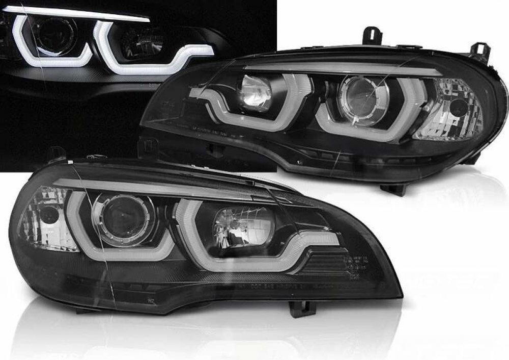 Přední světla BMW X5 E70 07-13 TUBE LIGHT DRL černá, homologace E - vyraženo na krytu světla. Snadná montáž výměnným způsobem, super cena, vysoce sportovní vzhled, cena za pár.