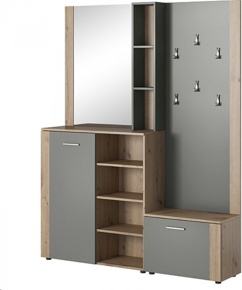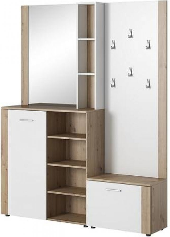 sestava se skládá ze dvou skříněk, zrcadla, odkládací plochy v podobě polic a šesti věšáků