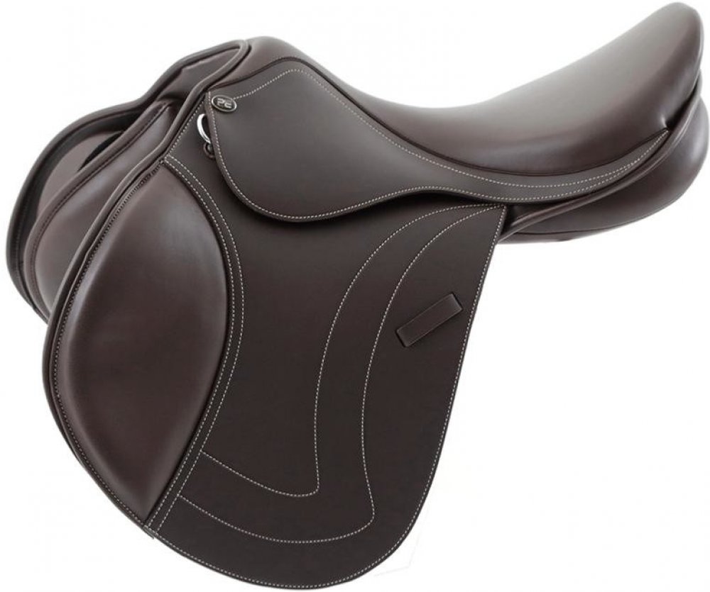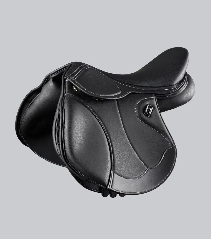 Skokové kontaktní sedlo pro koně vyrobené ze syntetické kůže z mikrovlákna. Sedlo má měnitelné komory.