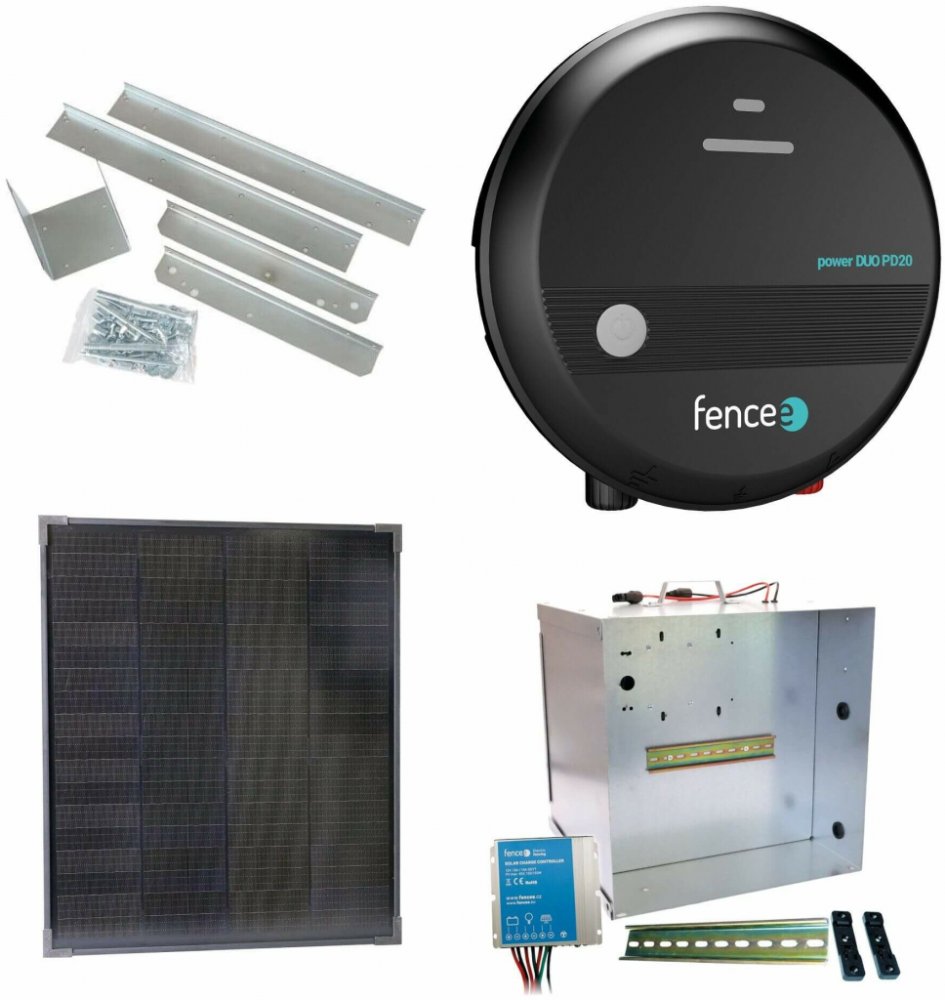 Sada solárně napájeného ohradníku s kombinovaným zdrojem 230/12 V o výkonu 2 J. Obsahuje kompletní přenosnou schránku na zdroj ohrady/baterii s regulátorem 10 A pro solární panel 40 W. Montážní konzole pro instalaci panelu na schránku pro přepravu.