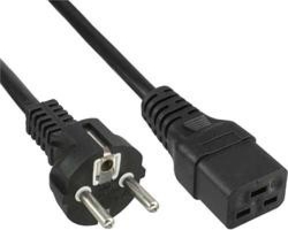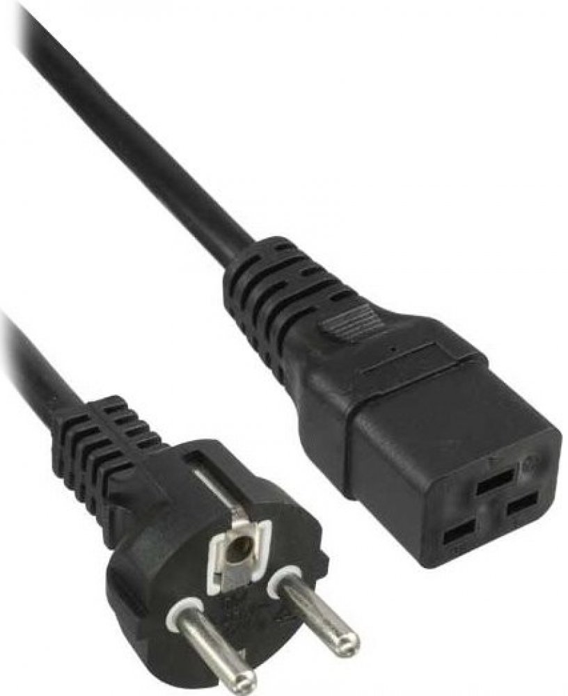 Napájecí kabel v černém provedení pro počítač nebo UPS s konektorem IEC 320 C19 pro 16A . Třížilový kabel je zakončený přístrojovou zástrčkou.
