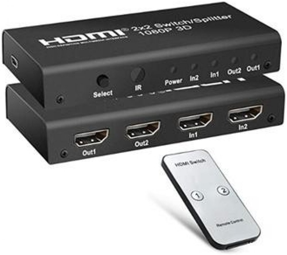 Zařízení umožní ze dvou vstupů HDMI jeden vybrat a zobrazit signál na dvou výstupech zároveň (monitorech/TV..) HDMI. Funguje jako zesilovač signálu, splitter a přepínač.