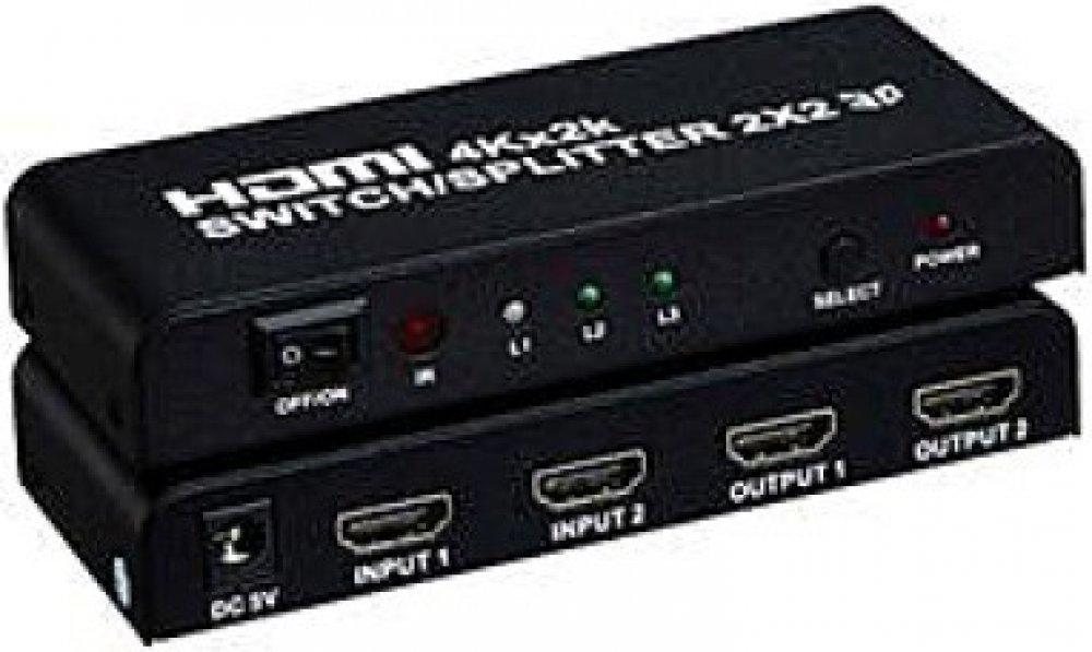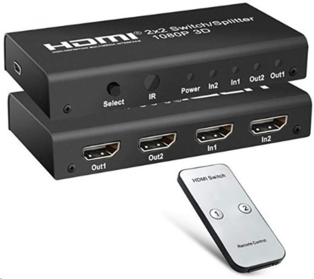 Zařízení umožní ze dvou vstupů HDMI jeden vybrat a zobrazit signál na dvou výstupech zároveň (monitorech/TV..) HDMI. Funguje jako zesilovač signálu, splitter a přepínač.