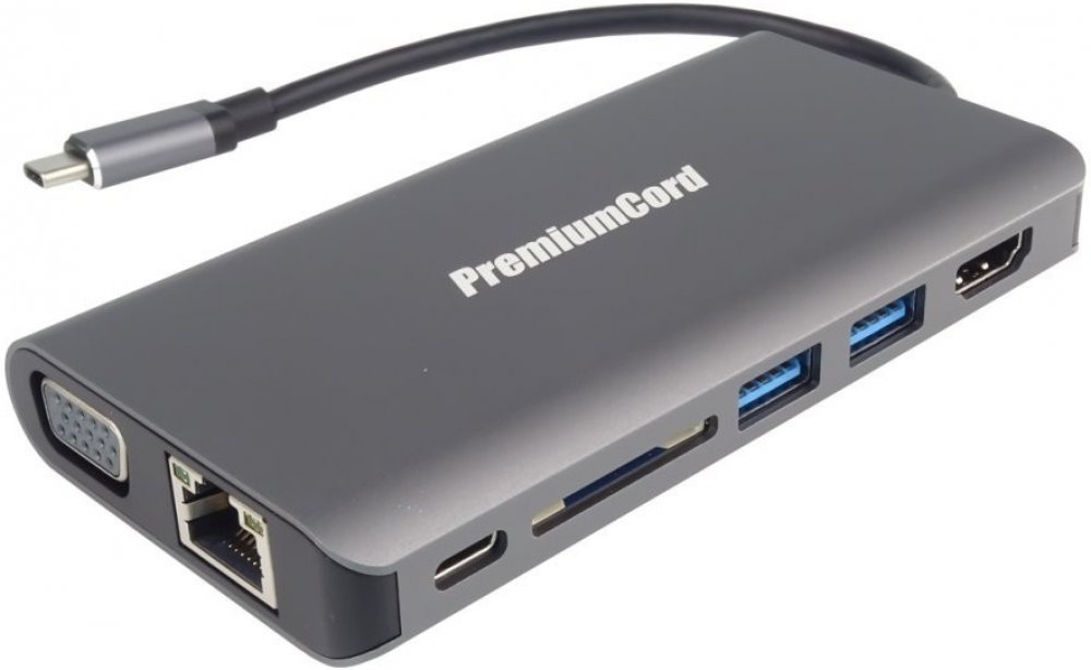 PremiumCord Převodník USB3.1 typ C na HDMI + VGA + RJ45 + 2xUSB3.0 + SD card + 3,5mm + PD charge, hliníkové pouzdro