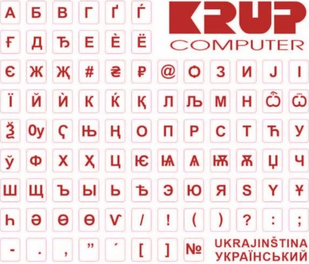 Speciální samolepící fólie s ukrajinskými znaky v červené barvě na průhledném pozadí pro polepení klávesnice notebooku nebo klávesnice ke stolní počítačům. Velikost přelepky je 6 x 7 mm.