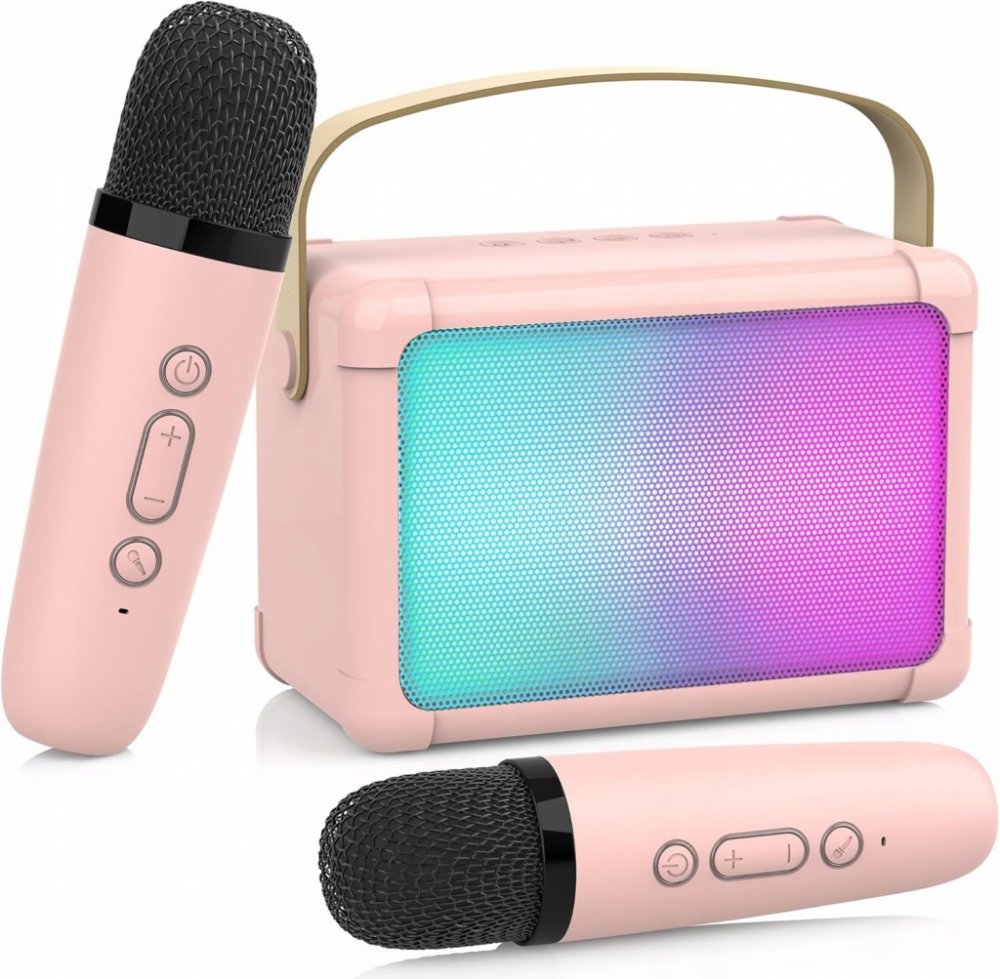 VÝKONNÝ KARAOKE REPRODUKTOR S MIKROFONY 3V1 LED OSVĚTLENÍ PRO DĚTIKaraoke reproduktor s bezdrátovými mikrofony, podpora TF/USB karet, AUX vstup
