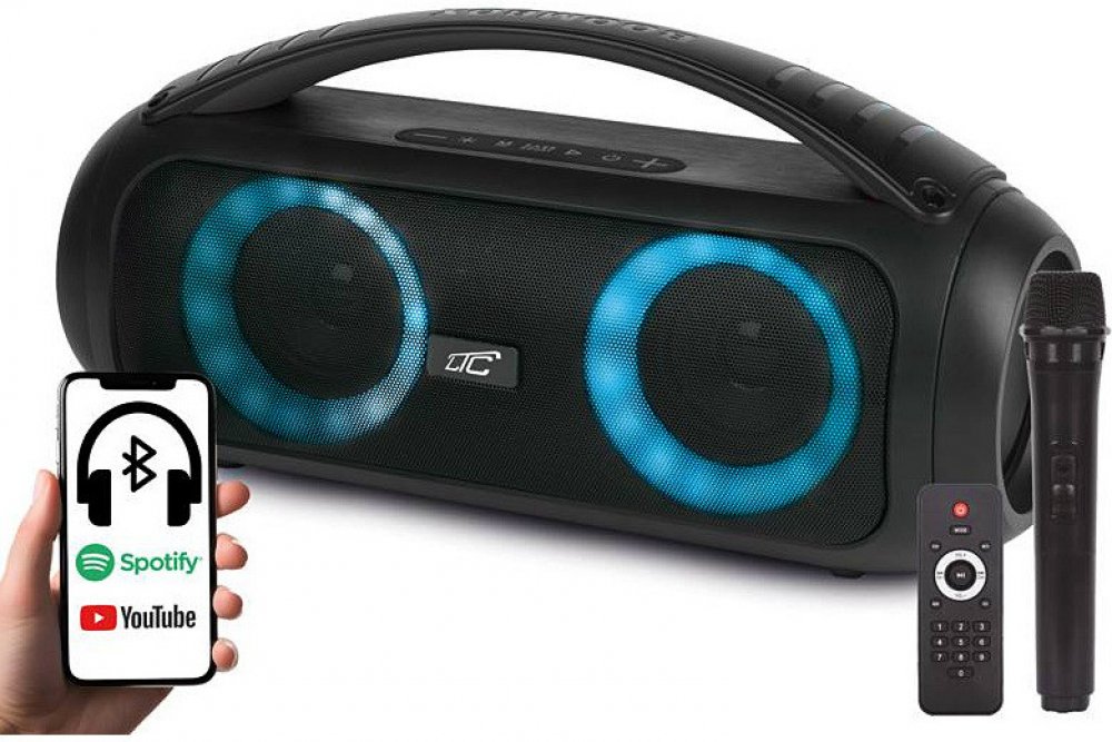 Bluetooth reproduktor Boombox LTC s mikrofonem a dálkovým ovládáním, 2x3" - přenosná párty na dosah ruky! Poskytne vynikající kvalitu zvuku za každých podmínek. Tento jedinečný reproduktor, vybavený mikrofonem a dálkovým ovládáním, je ideální volbou pro párty, karaoke a prezentace. Díky své působivé síle a moderním funkcím udělá každý.