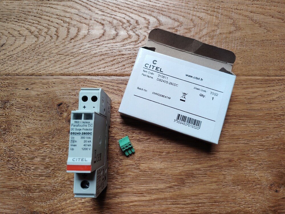 Prodám Elektromateriál pro Solární FV systémy - DC Ochrana - Svodič přepětí, resp. přepěťová ochrana pro stejnosměrný DC na DIN lištu 35mm pro ochranu vodičů do 16/10 mm2 před atmosférickým a indukováním přepětím na 280VDC od výrobce CITEL model DS240S-280VDC
