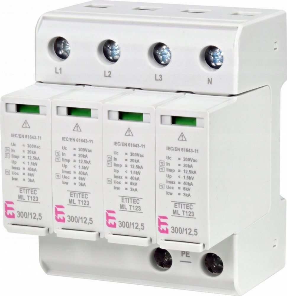 Atmosférické výboje mohou způsobit nebezpečné přepětí v elektrickém systému, což způsobuje poškození instalací, elektrických zařízení a dokonce i požár. Omezovač přepětí ETITEC ML T123 300/12,5 představuje maximálně univerzální typ, který splňuje požadavky jako typ T1 nebo T2 nebo T3 a chrání tak před přepětím způsobeným přímým, nepřímým nebo spojovacím výbojem