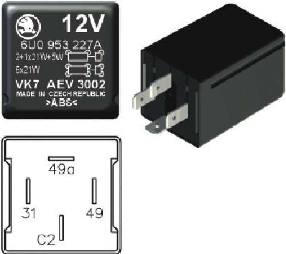 Elektronický přerušovač směrových a varovných světel pro provoz osobních automobilů s přívěsem. Správná funkce směrových světel přívěsu je signalizována kontrolkou C2. Výpadek žárovky na vozidle bez přívěsu je signalizován rychlým blikáním, výpadek žárovky s přívěsem je signalizován nesvícením kontrolky C2. Např. Felicia. 118-922081, AEV3002, 6UO 953 227A, 6U0 953 227A, 6UO953227A, 6U0953227A