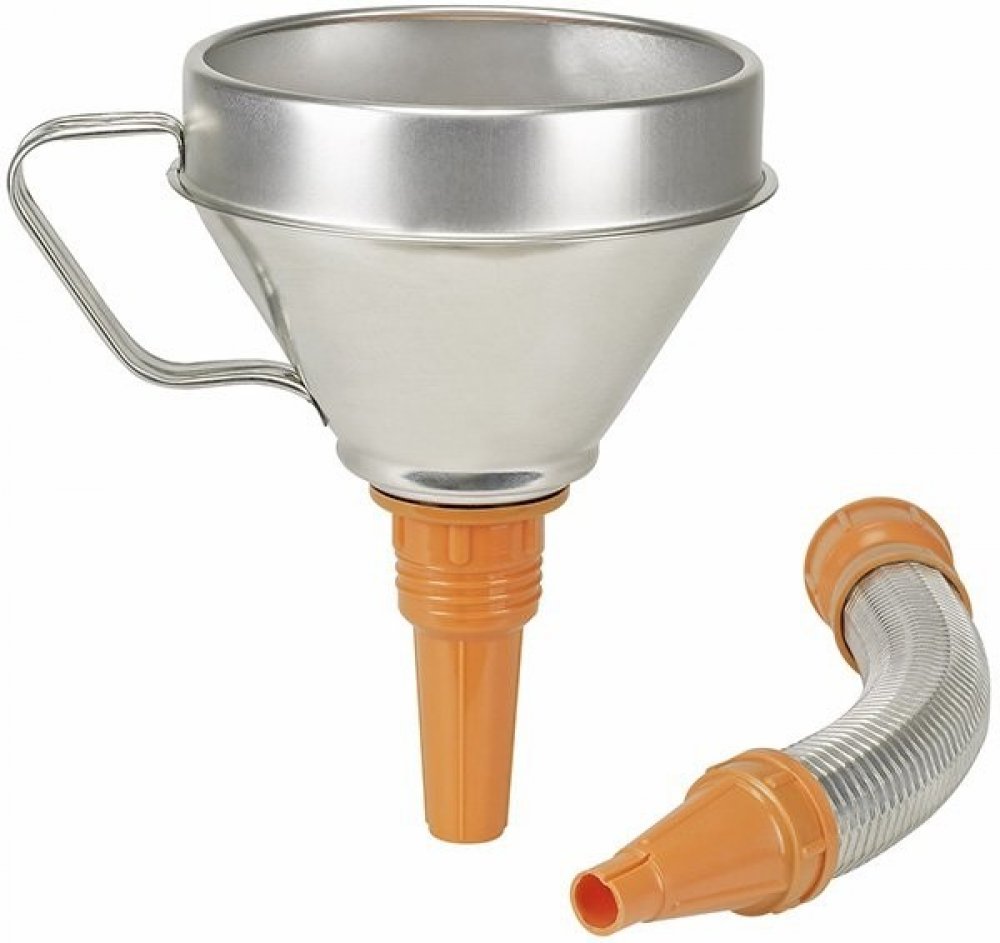 Kvalitní trychtýř z bílého plechu s vyšším límcem, s ergonomickým držadlem a s našroubovatelným kovovým pružným výtokovým nástavcem s plastovou koncovkou dobře odolává olejům, kyselinám, pohonným hmotám, příp. prasknutí. Použití: díky vysokému průtočnému množství - průmysl, opravárenství, řemeslná výroba, dílny apod. Materiál: trychýř - pozinkovaný ocelový plech, pružná výtoková trubice - kov, vý...
