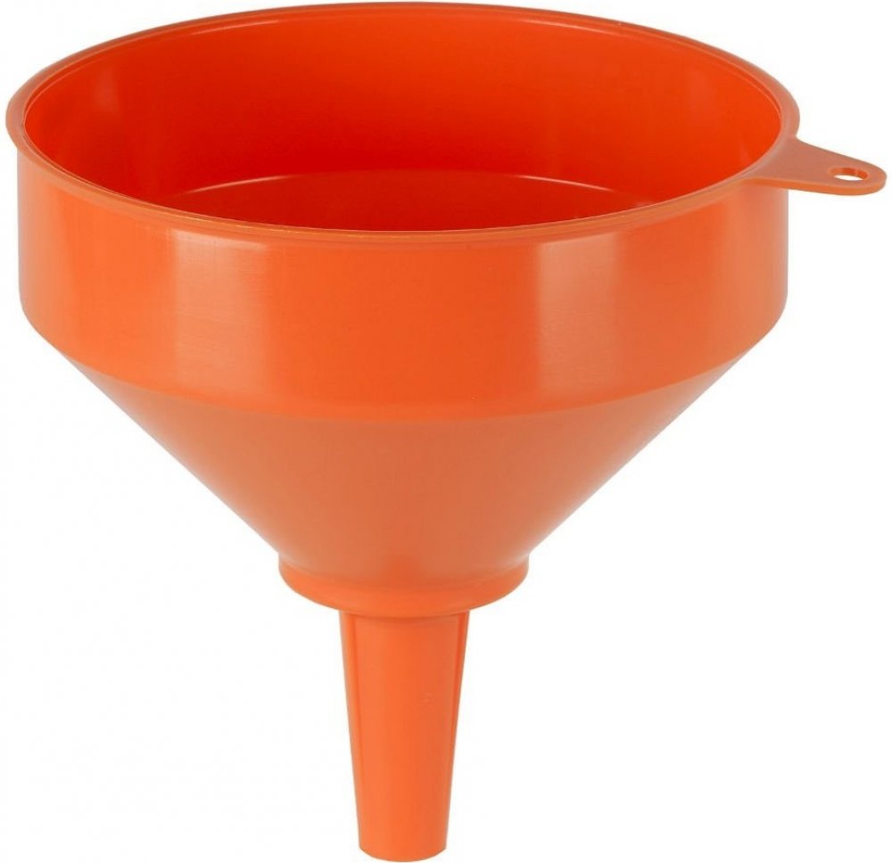 Plastový trychtýř s vyšším límcem, výlevkou s odvzdušňovacími žlábky, se závěsným očkem a s vyměnitelným sítkem. Dobře odolává olejům, kyselinám, pohonným hmotám a prasknutí.