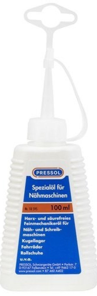 Speciální olej pro šicí stroje a pro jemnou mechaniku (Spezialöl für Nähmaschinen) vysoké kvality v plastové lahvičce 100 ml opatřené závěsem se výborně osvědčil i pro kuličková ložiska apod.