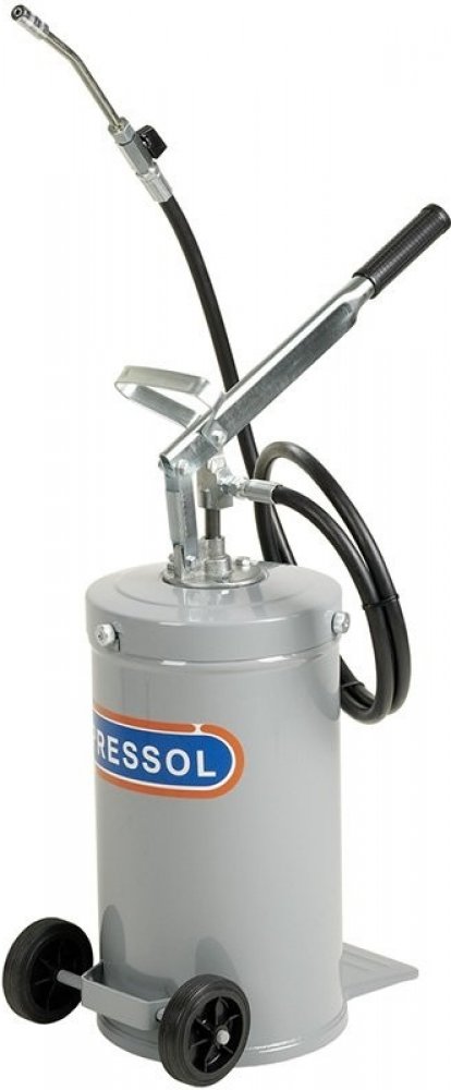 Pojízdný ruční pákový mazací přístroj s kovovým zásobníkem a podvozkem se 2 kolečky umožňuje mazání různými plastickými mazivy (až do klasifikace NLGI 2).
