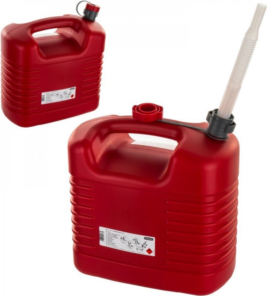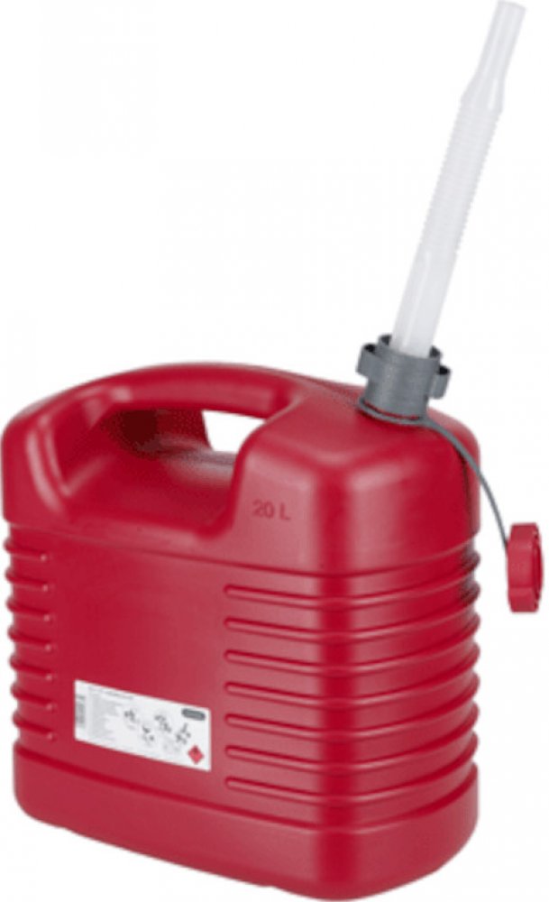 Vojenský kanystr na palivo (20 l, olivový) od PRESSOL s flexibilní výstupní trubkou.