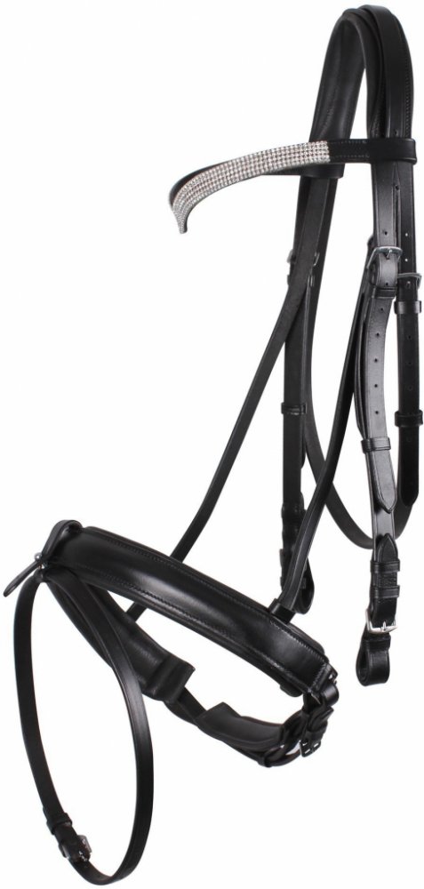 Elegantní kožená uzdečka s nastavitelným švédským kombinovaným nánosníkem. Krásná čelenka ve tvaru písmene V, která je zdobena stříbrnými třpytivými kamínky, aby opticky snížila velikost hlavy a zvýšila eleganci. Dodává se s otěžemi. V černém provedení.