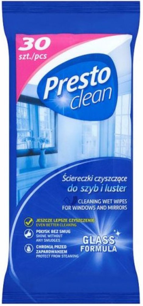 Čisticí ubrousky na okna a zrcadla PRESTO účinně odstraňují nečistoty a otisky prstů díky obsahu povrchově aktivních látek. Vlhčené ubrousky jsou vhodné pro každodenní čištění skleněných ploch, jakými jsou okna, zrcadla nebo skleněné desky stolů. Zanechávají lesklý povrch bez šmouh díky složení obohacenému o alkohol. Zamezují zamlžování díky obsahu protipárové složky. Zabraňují ulpívání prachu dík...